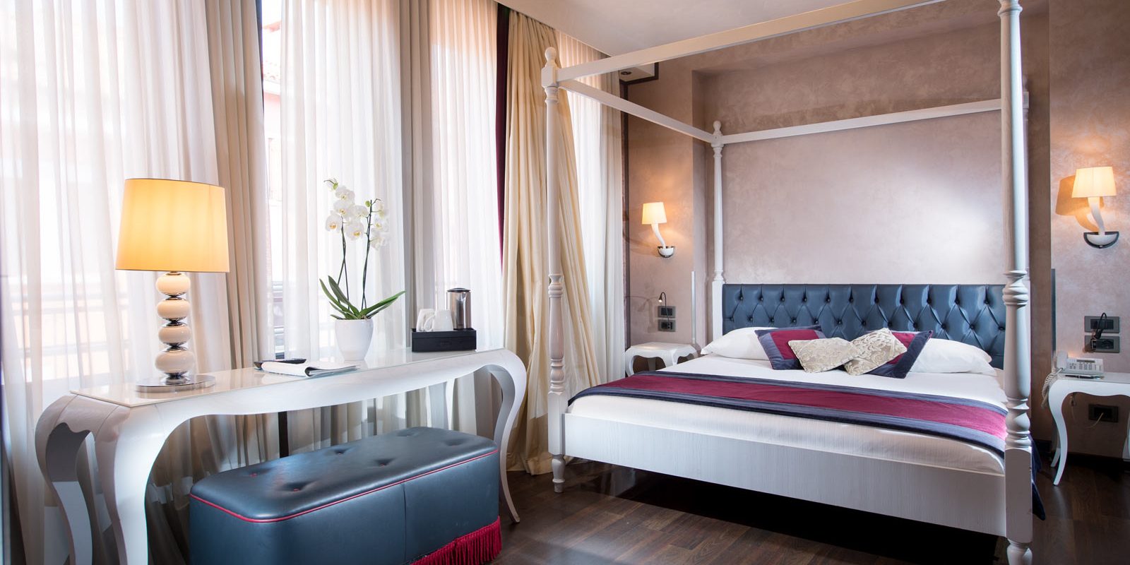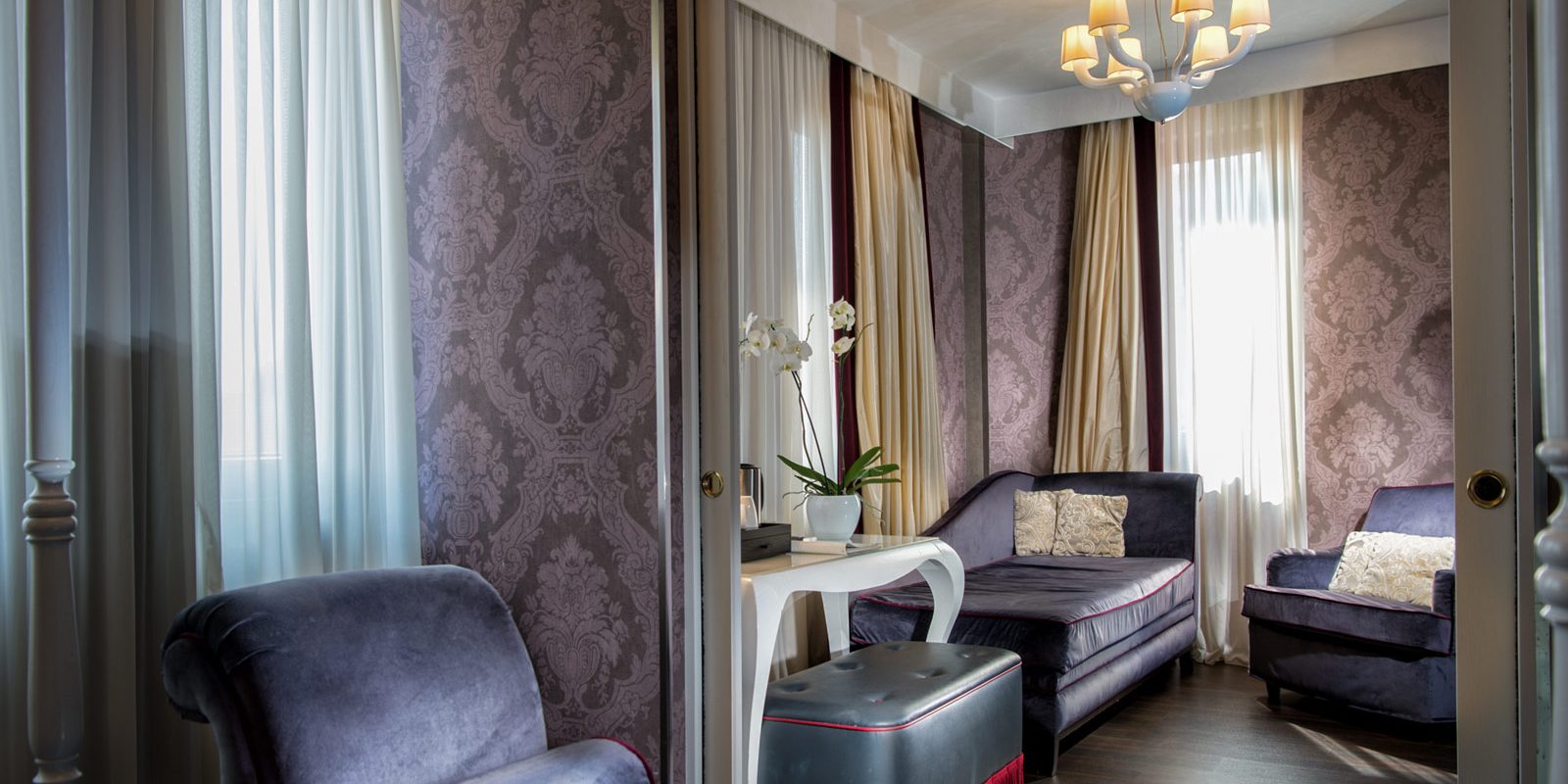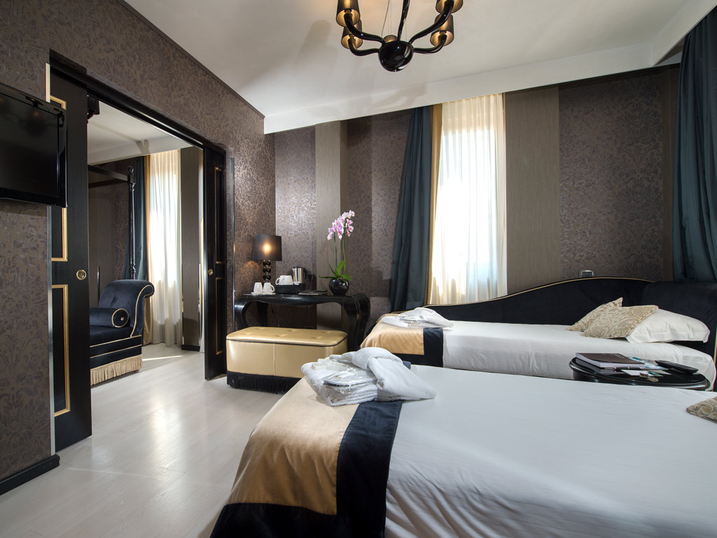 Le famiglie numerose apprezzeranno questa magnifica camera di 60 mq squisitamente arredata in stile veneziano contemporaneo in tonalità nero-oro, color melanzana o bianco-argento. Immerso in un angolo privato dell’hotel, due ampie camere da letto, ognuna con il proprio bagno e un piccolo salone che può facilmente diventare una zona privata; garantendo un livello di eleganza e privacy unico. Questa meravigliosa Suite offre una splendida vista sul nostro Giardino Segreto e sulla città di Venezia e si compone di due letti matrimoniali a baldacchino e due chaise-longue che si trasformano, ciascuna, in un comodo letto singolo, permettendo quindi di ospitare fino a 6 persone.