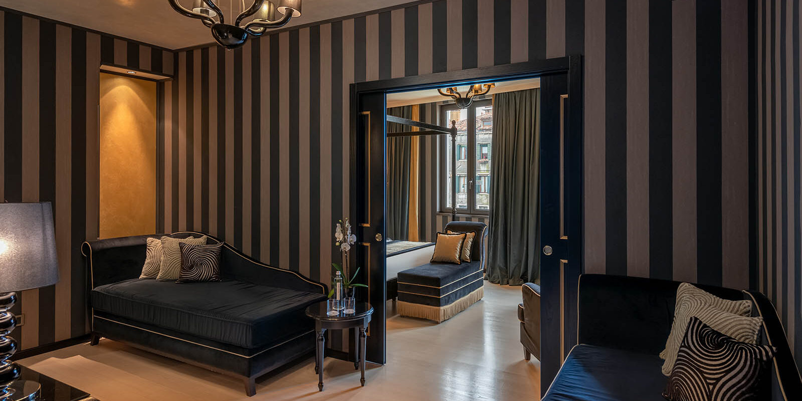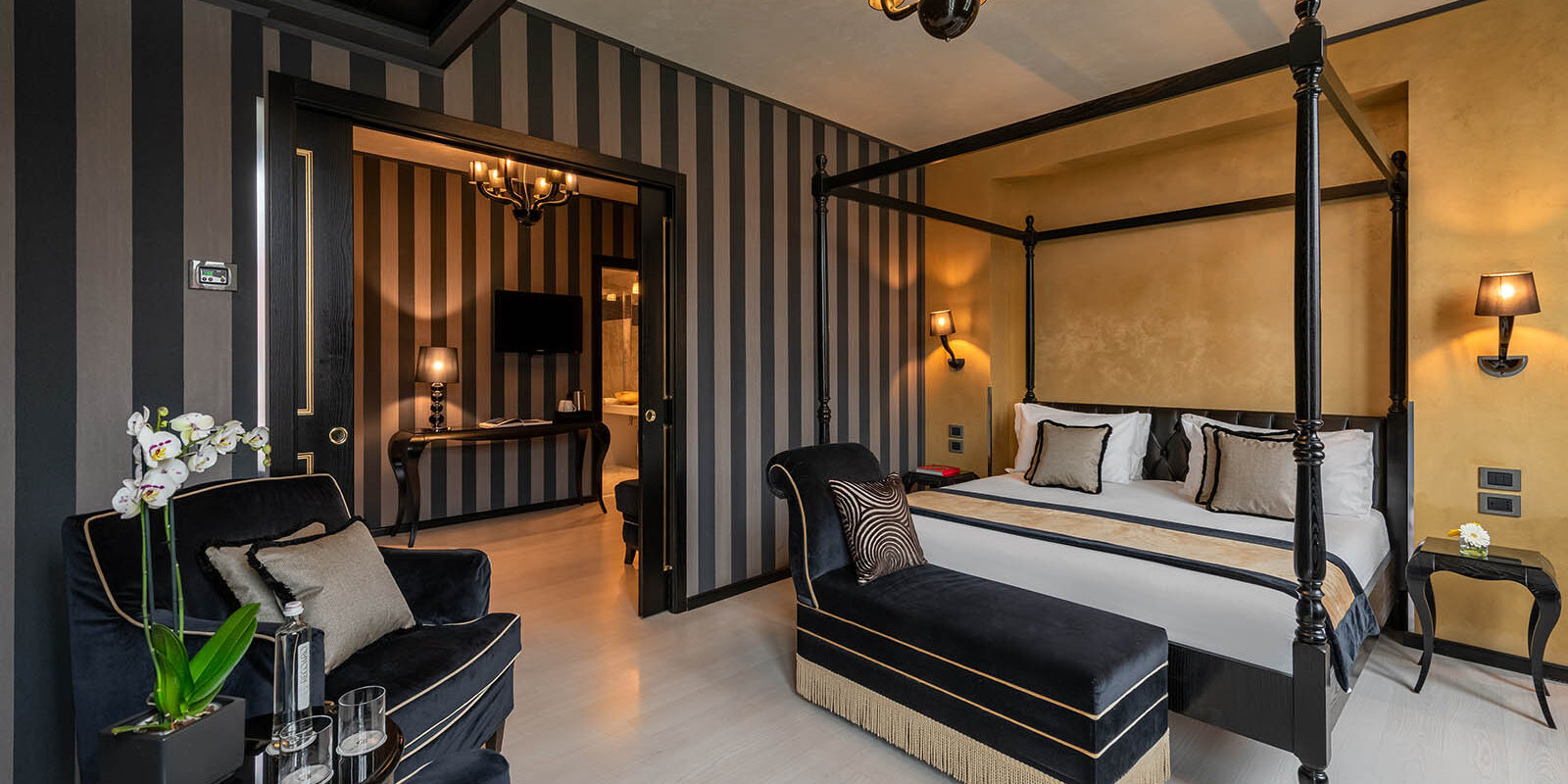 Premiati con le nostre esclusive Suites con Vista Canale, dotate di camera da letto e soggiorno separati con vista in prima fila sull’affascinante Canale di Cannaregio e sul Ponte dei Tre Archi. Preziosamente arredate nelle tonalità stravaganti del nero e oro, la camera da letto presenta un letto matrimoniale king-size a baldacchino. Diviso da due eleganti porte scorrevoli, la tua zona soggiorno offre uno scrittoio, un tavolino più piccolo, moderne lampade in vetro di Murano e due magnifiche chaises longue. Equipaggiate con un sistema di ricambio d’aria costante, pavimento in parquet e carta da parati garantiscono il vostro benessere e un lusso fresco e luminoso. Situate al primo e secondo piano, queste eleganti Suites di 45mq con influenze veneziane sono perfettamente progettate per famiglie, gruppi di amici e coppie che si prendono il tempo per rilassarsi e riconnettere. Consenti altri due membri della famiglia o amici intimi di condividere il tuo spazio, trasformando le chaises longue in un letto singolo ciascuna e crea un ambiente grazioso per riunirti con i tuoi cari. Rinfrescati con una tonificante doccia a pioggia o fai un lungo e piacevole bagno nella tua vasca da bagno separata in Corian. Il tuo elegante bagno in marmo Calacatta offre anche luci di cromoterapia e una consolle doppia con due scintillanti lavandini placcati in foglia d’oro.