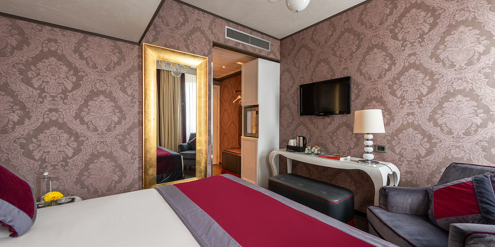 Alluringly intimate room of 18mq, fully equipped to grant the most sophisticated and stylish comfort. Dramatic black and gold or lavish aubergine fabrics together with contemporary world-famous Murano-glass lighting combine to give you the feeling of your very own little piece of Venetian splendour. Some rooms have views to the city and some others overlook our internal courtyard. Equipped with a constant air exchange system, parquet floors and wallpaper, they guarantee your well-being and a fresh and bright luxury. A queen-size bed, a bench and a writing table complete the atmosphere, as the open closet gives a modern twist. The elegant bathroom in Calacatta Marble boasts a refreshing rain shower with chromotherapy lights and a vanity with a glittery sink in silver or gold leaf.