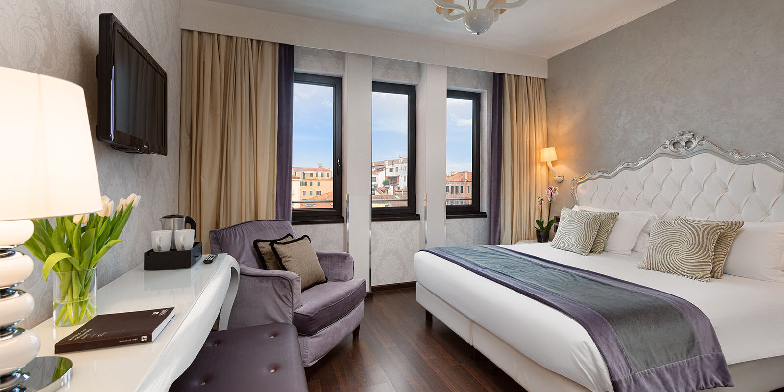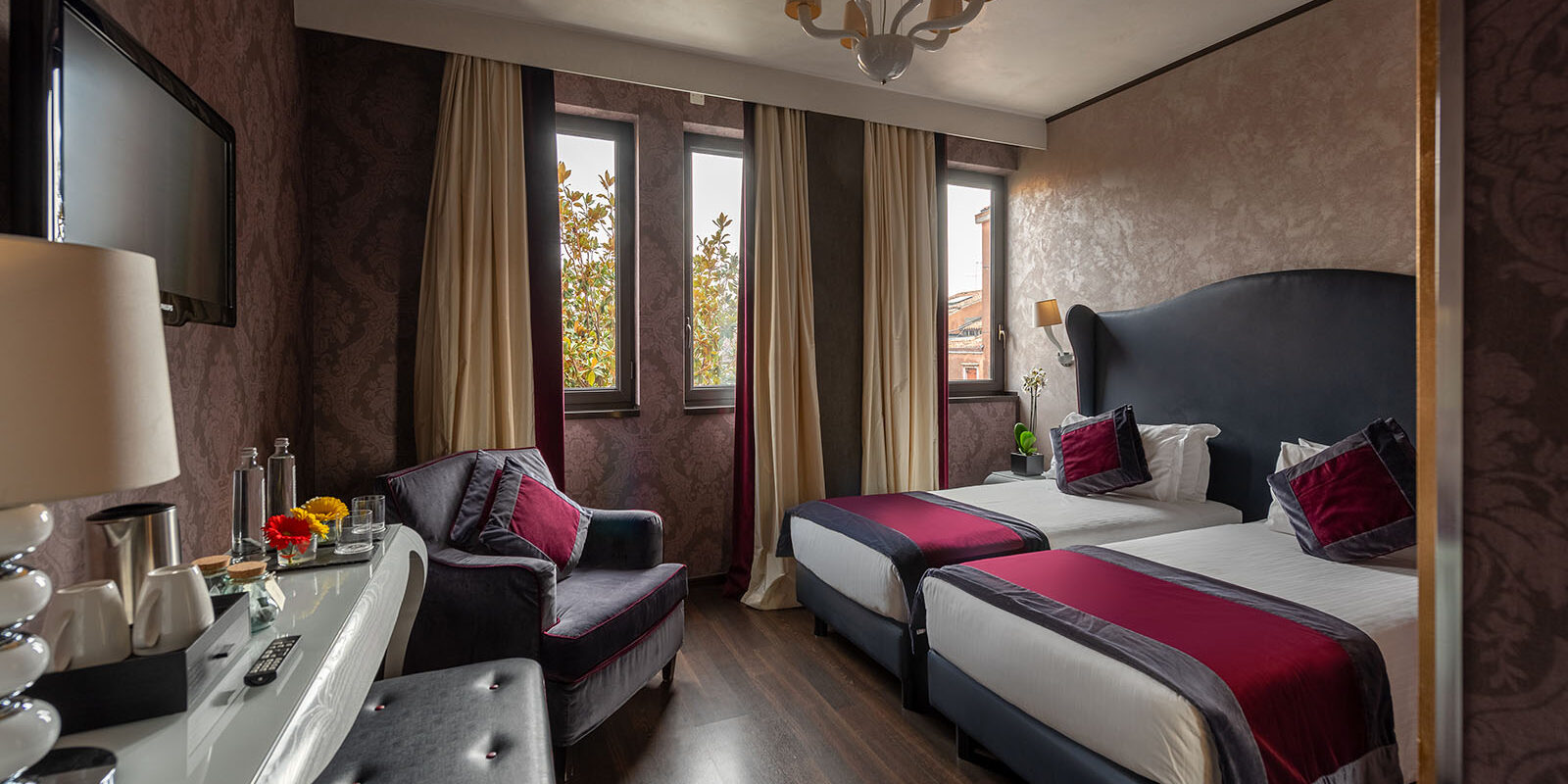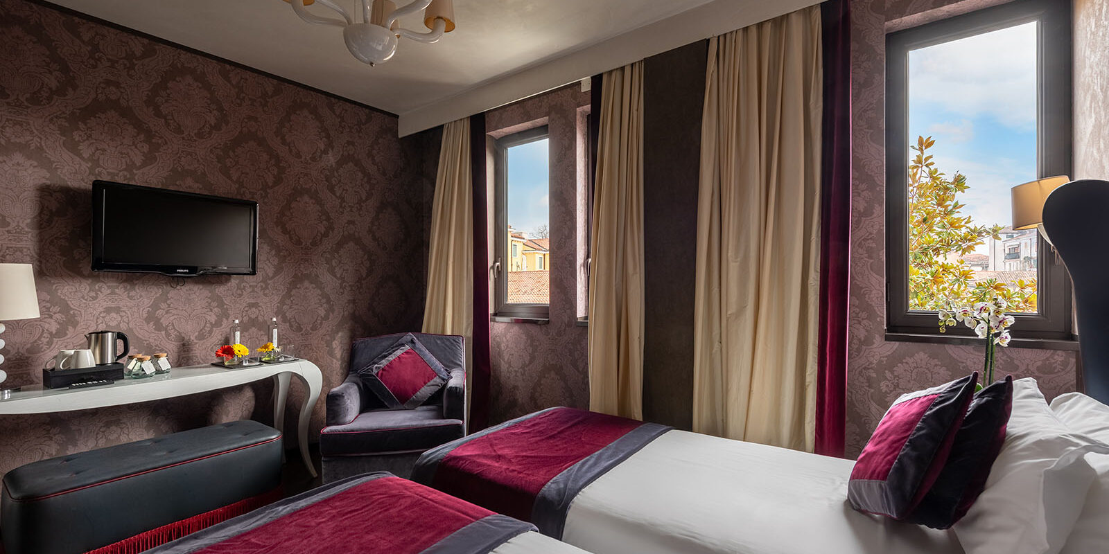 Reciba una calurosa bienvenida en nuestas habitaciones de 20 mq, diseñadas exquisitamente y maravillosamente decoradas con damascos venecianos en sensuales tonos negros y dorados, espléndidos aubergine o suaves tonos marfil y plateado. Disfrute de la relajante vista hacia nuestro jardín secreto o hacia la ciudad. Podrá elegir entre una cama matrionial o dos camas individuales, según sus preferencias. Equipadas con un sistema de intermabio de aire constante, suelos en parquet y papel tapiz, garantizan su bienestar y un lujo fresco y luminoso. Las contemporaneas lámparas de cristal de Murano, un escritorio, un banco y un armario abierto lo envuelven en un ambiente elegante y al mismo tiempo informal. El elegante baño en mármol Calacatta cuenta con una refrescante ducha de efecto lluvia, a ras de suelo o con una bañera en Corian con luces de cromoterapia. Este precioso baño cuenta tambien con un tocador y un reluciente lavabo en pan de oro o plata.