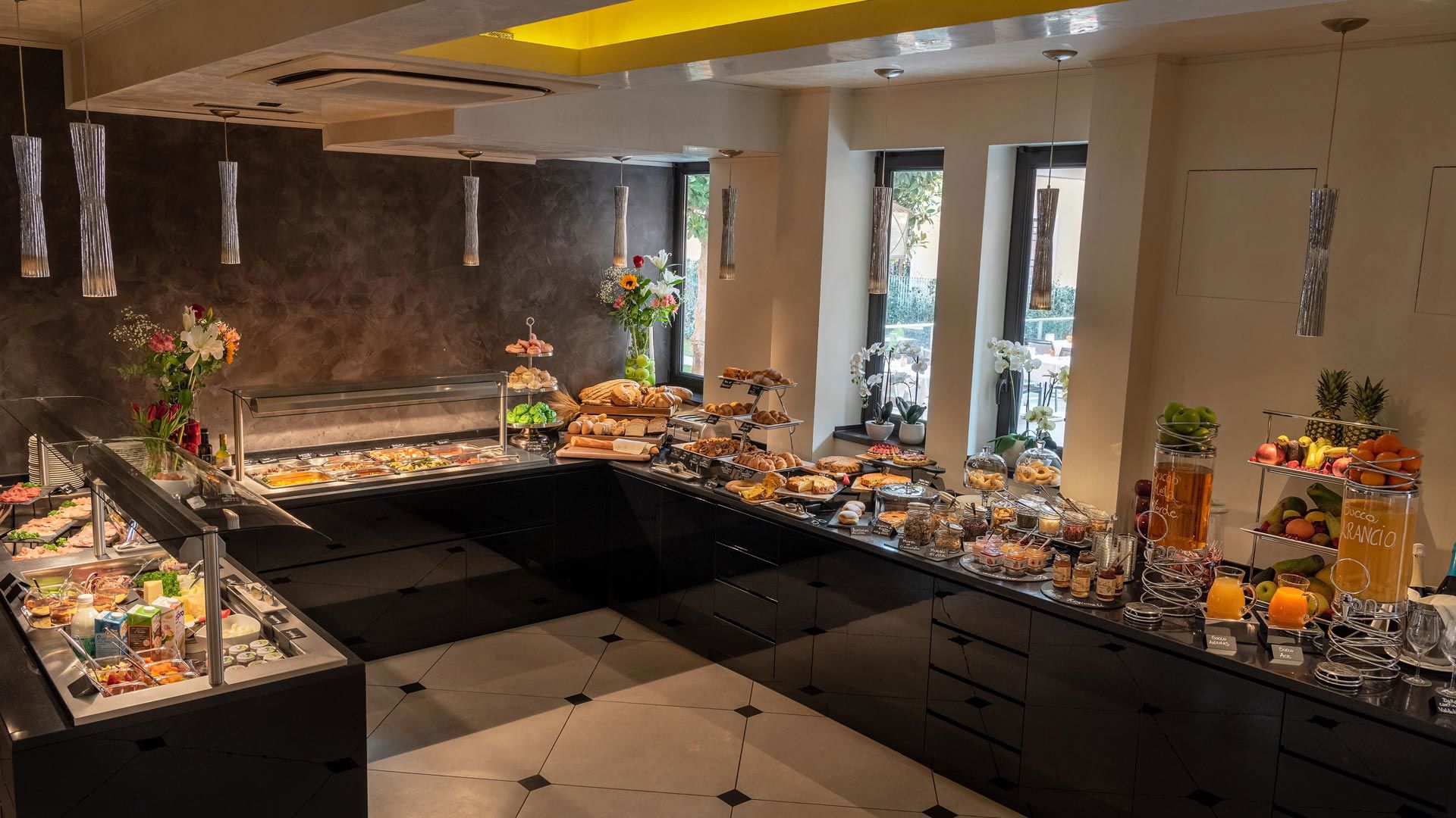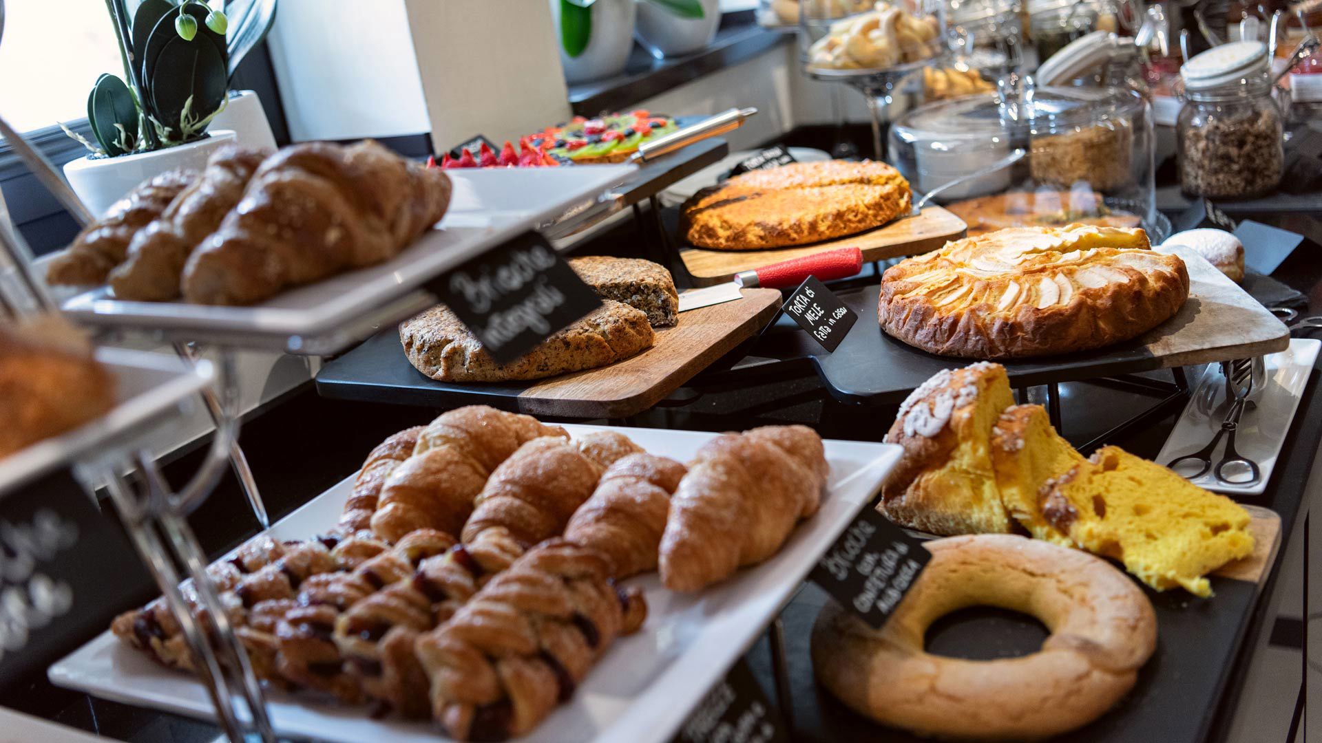 The pastry will offer you a different delight every day: you will find delicious cakes, croissants, fragrant biscuits and pastries, donuts and fresh cream donuts, fresh-baked bread, a rich variety of jam and honey, a wide choice of organic yogurt and cereals, fresh fruit and fruit compotes. The salty part will delight you with a wide selection of cooked meats and vegetables, local cheeses and cold cuts, fresh seasonal vegetables, bruschetta and savory buns.