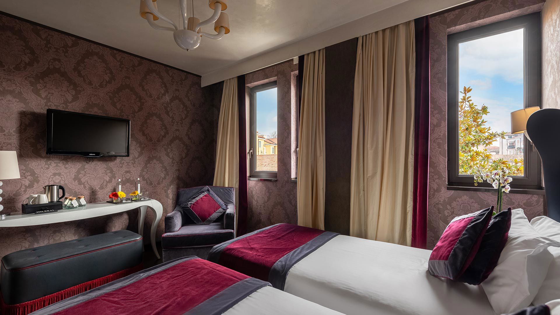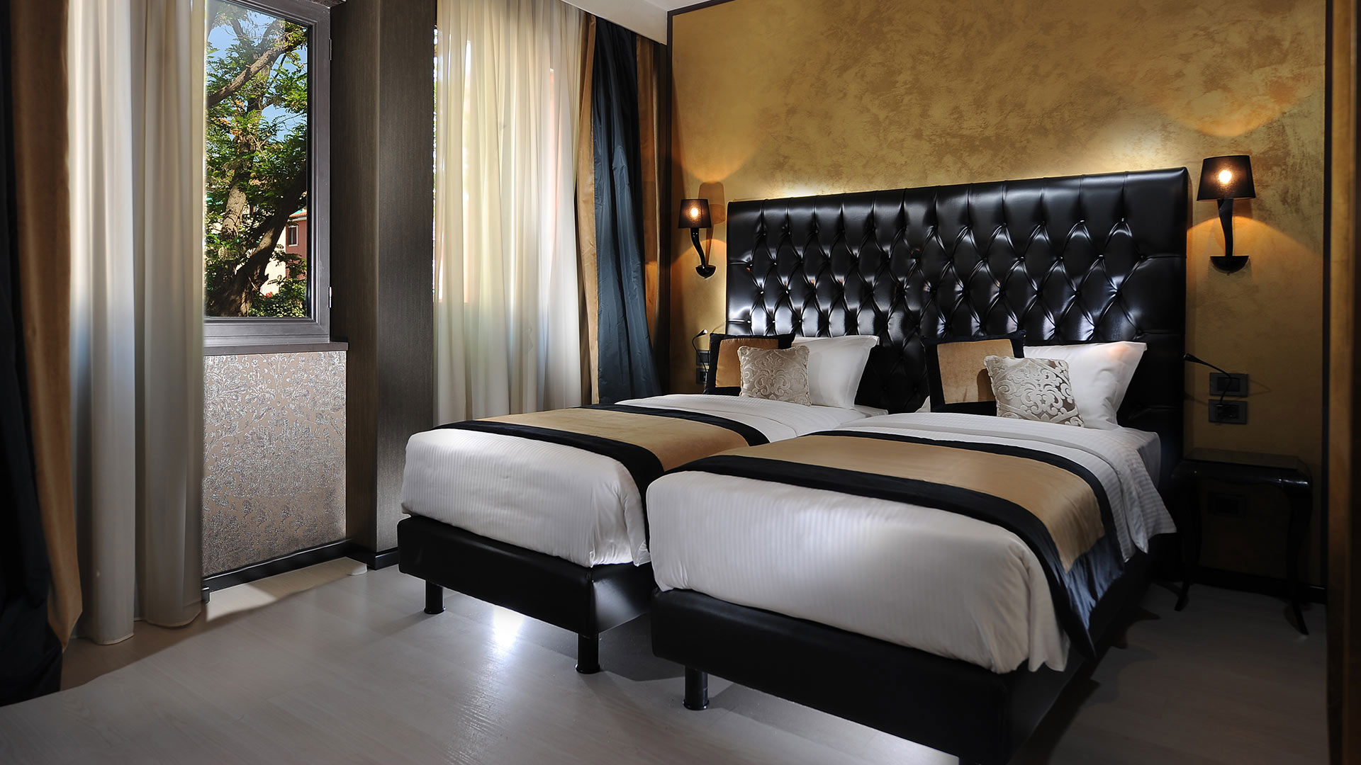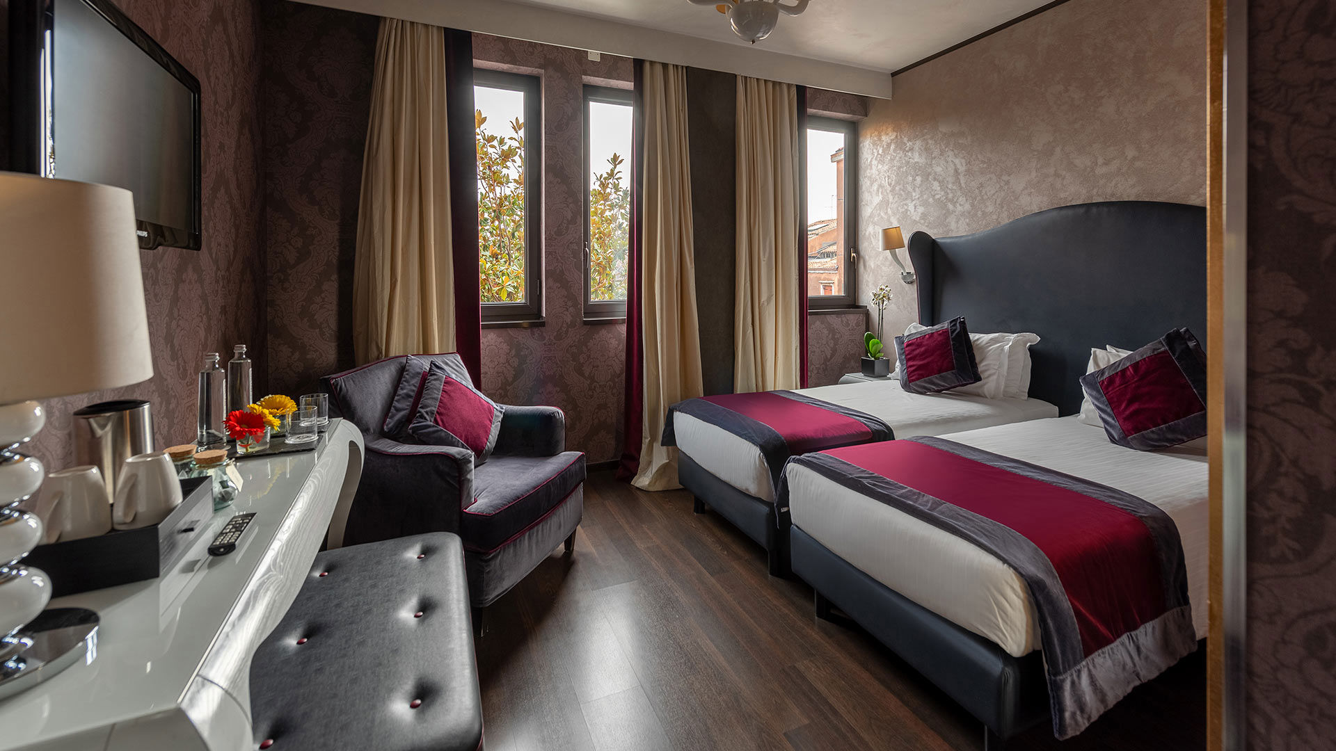 Be warmly welcomed by our exquisitely appointed and beautifully designed 20m2 rooms. Flanked by Venetian damask walls in sensual black and gold, lavish aubergine or calming ivory and silver tones, you will enjoy the relaxing view of our secret garden or to the city. You may choose from a queen-size bed or two twin-size beds, to suit your preference.
