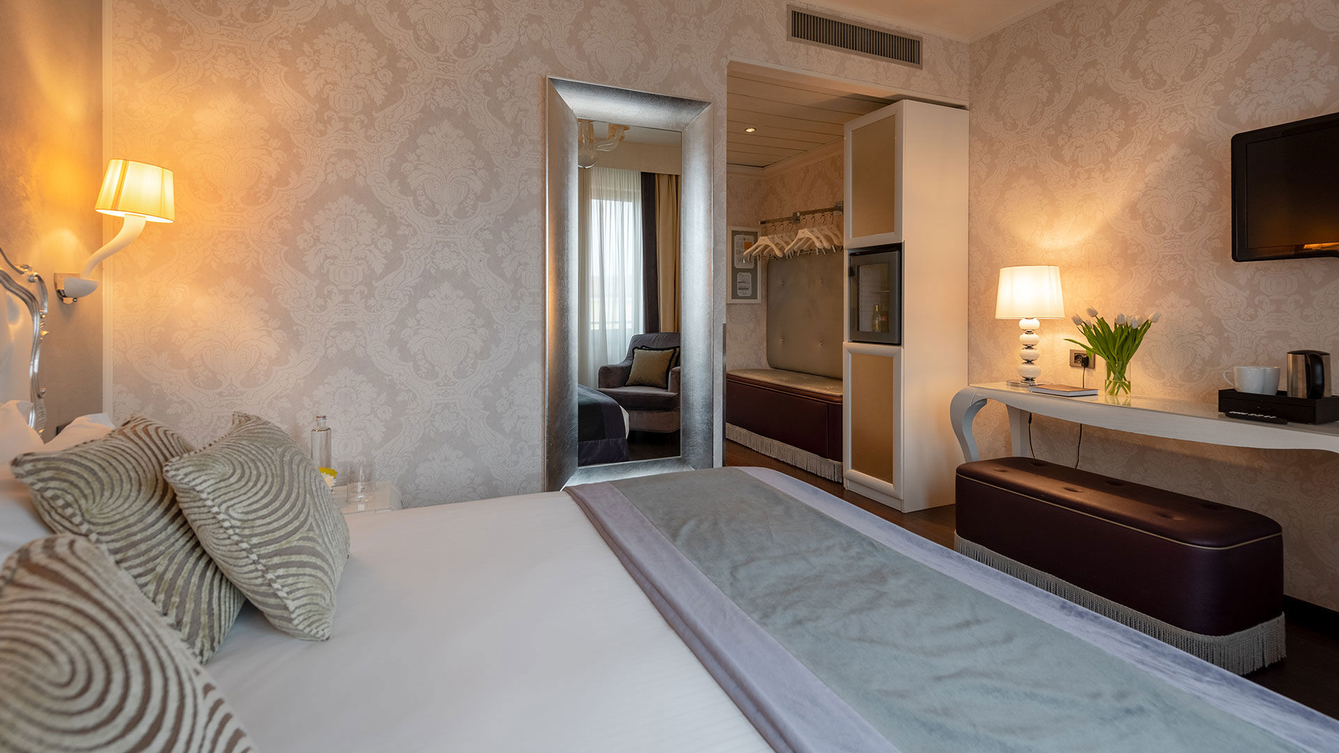 Equipped with a constant air exchange system, parquet floors and wallpaper, they guarantee your well-being and a fresh and bright luxury. Contemporary Murano Glass lamps, a writing table, a bench and an open closet surround you in a stylish yet informal atmosphere. The elegant bathroom, in Calacatta Marble boasts a refreshing walk-in rain shower or a Corian bath tub with chromotherapy lights and a vanity with a glittery sink in silver or gold leaf.