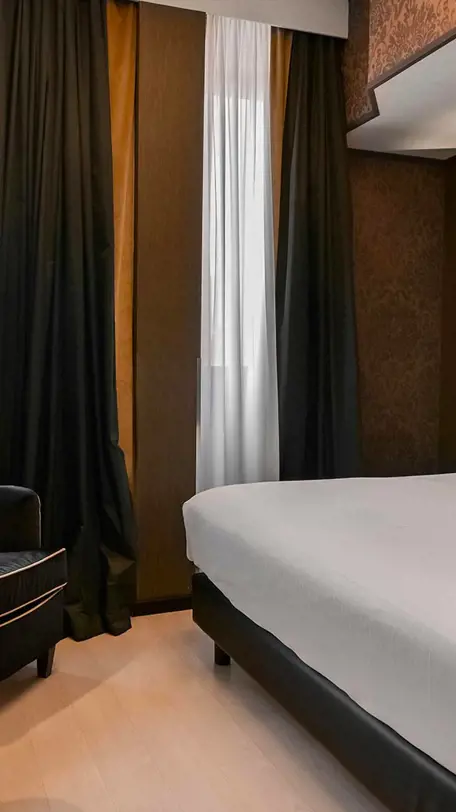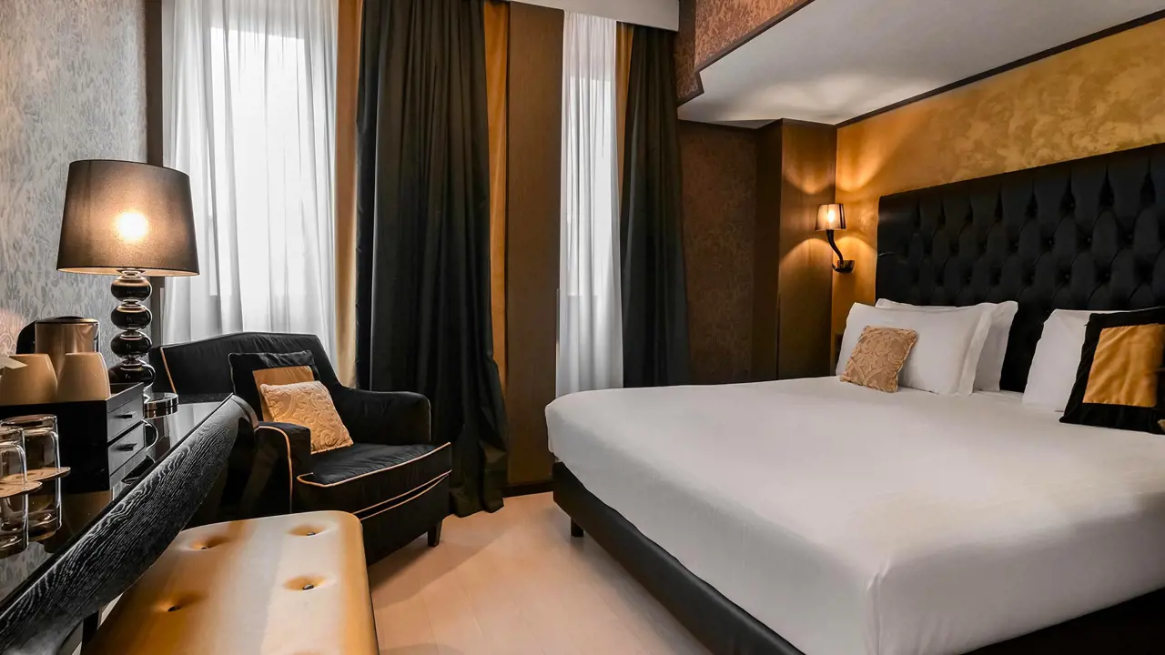 Alluringly intimate room of 18mq, fully equipped to grant the most sophisticated and stylish comfort. Dramatic black and gold or lavish aubergine fabrics together with contemporary world-famous Murano-glass lighting combine to give you the feeling of your very own little piece of Venetian splendour. Some rooms have views to the city and some others overlook our internal courtyard.