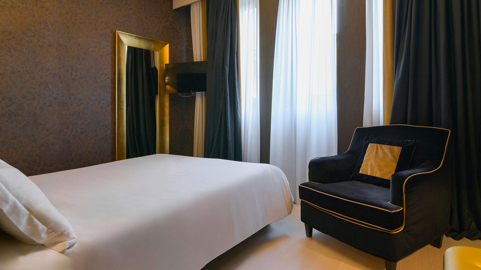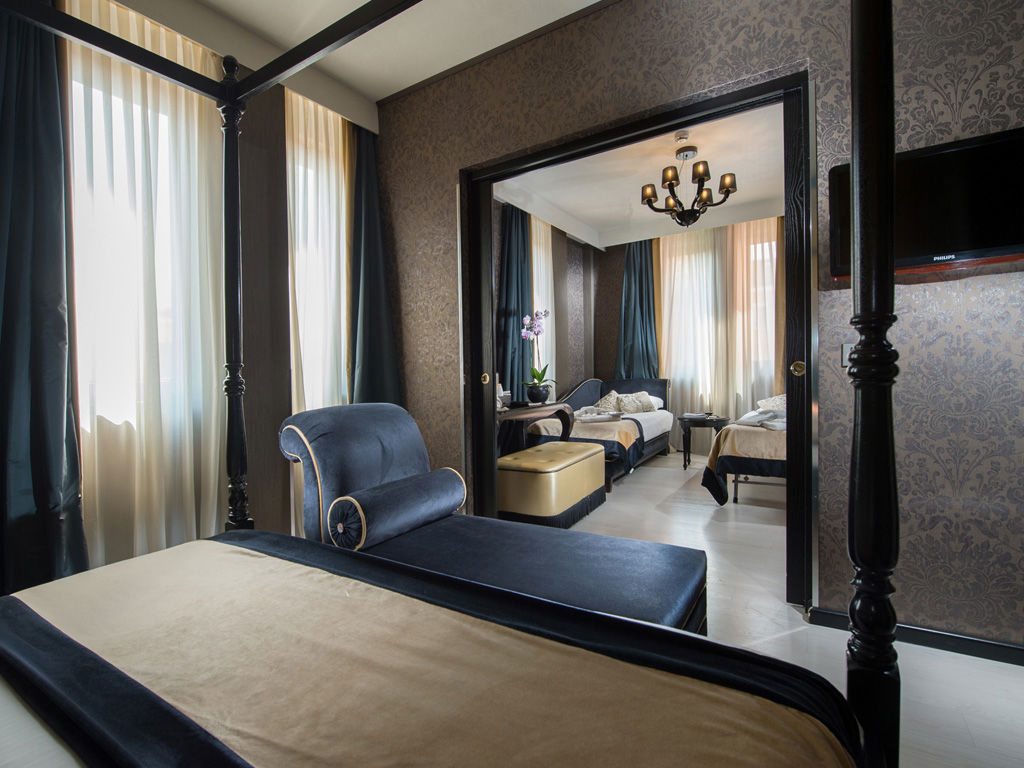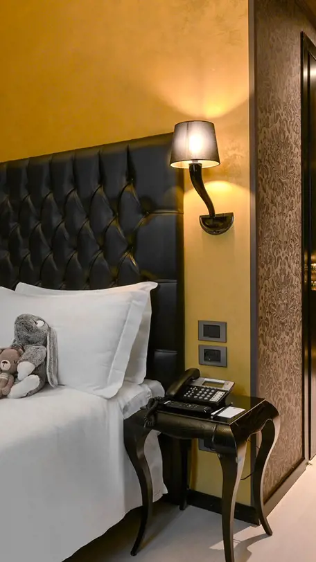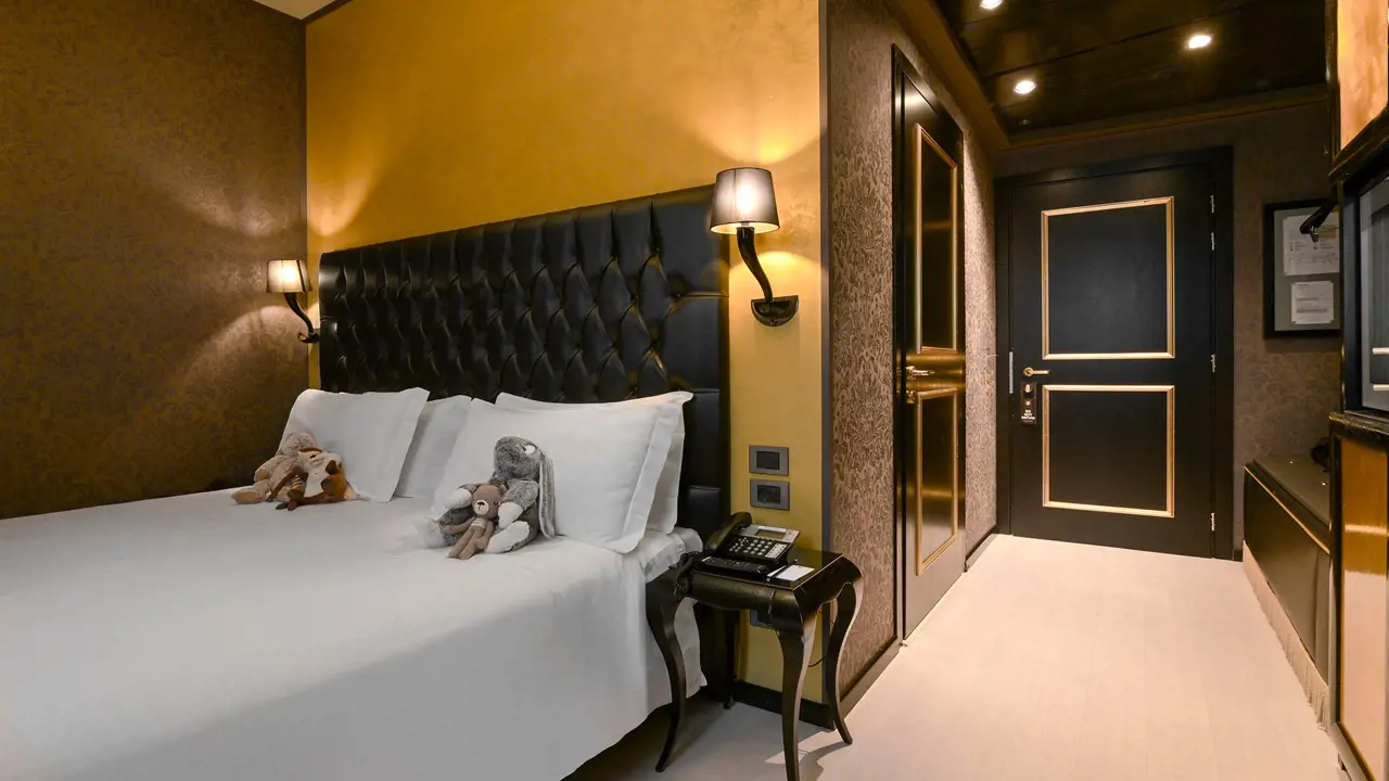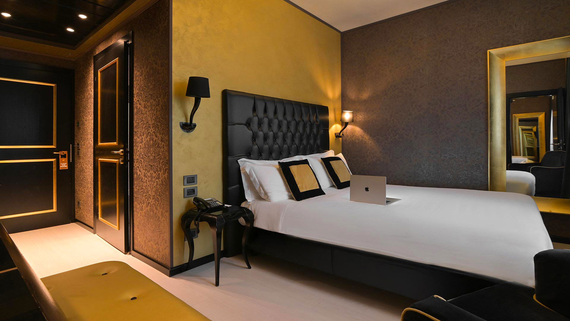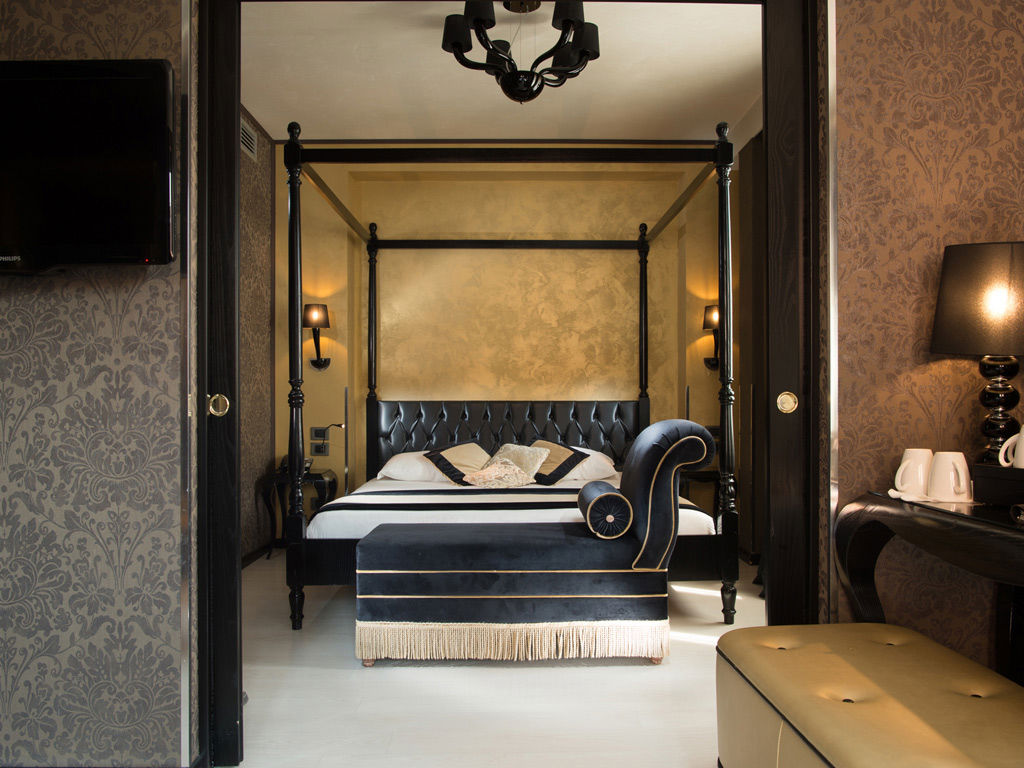 Be warmly welcomed by our exquisitely appointed and beautifully designed 20m2 rooms each. Flanked by Venetian damask walls in sensual black and gold, you will enjoy the relaxing view of our secret garden. You may choose from a queen-size bed or two twin-size beds in each room, to suit your preference. Equipped with a constant air exchange system, parquet floors and wallpaper, they guarantee your well-being and a fresh and bright luxury. Contemporary Murano Glass lamps, a writing table, a bench and an open closet surround you in a stylish yet informal atmosphere. The elegant bathroom of each room, in Calacatta Marble boasts a refreshing walk-in rain shower with chromotherapy lights and a vanity with a glittery sink in gold leaf.