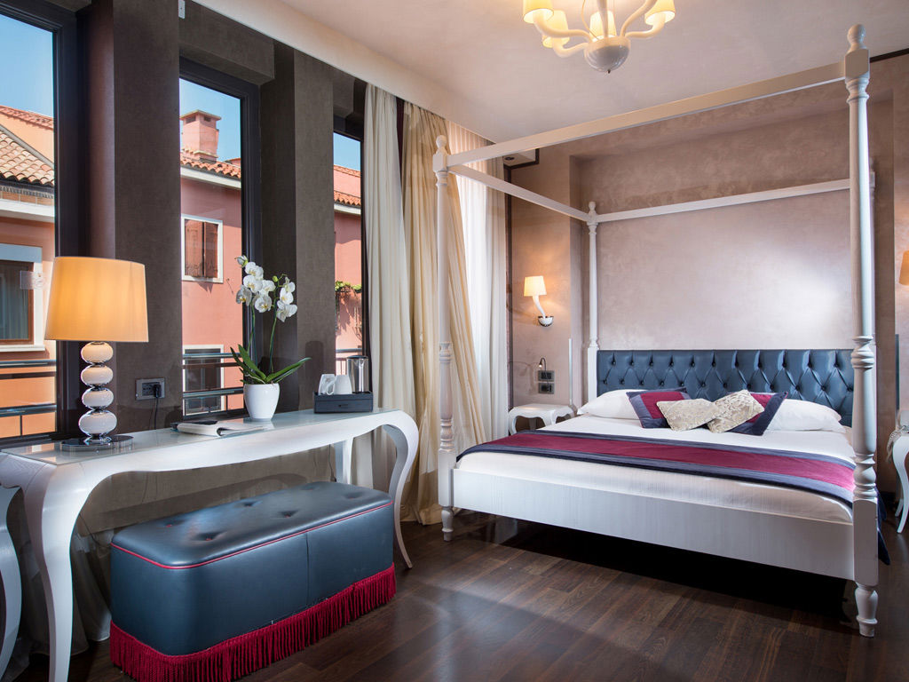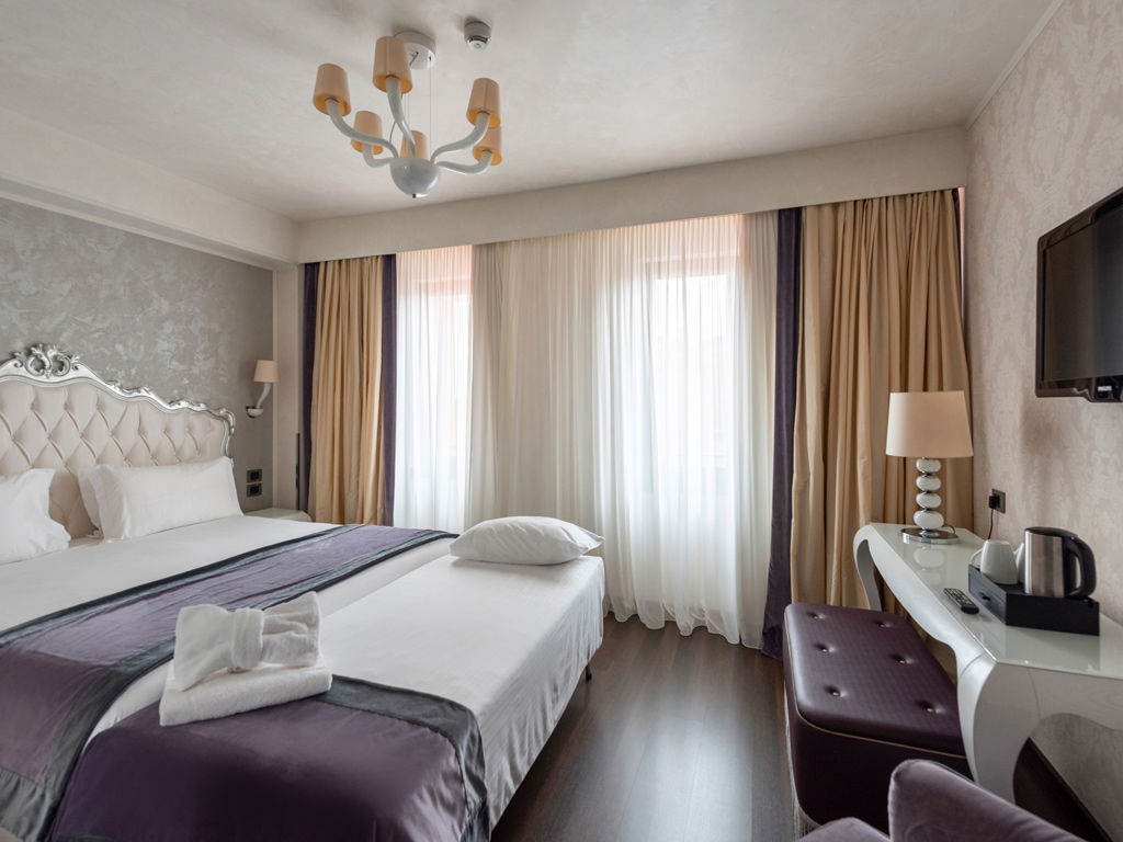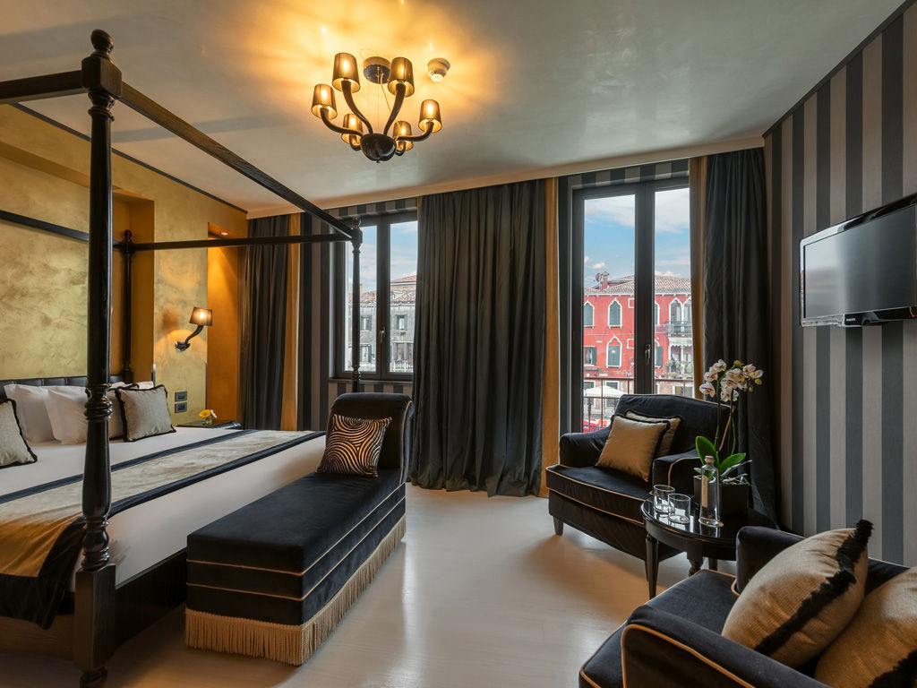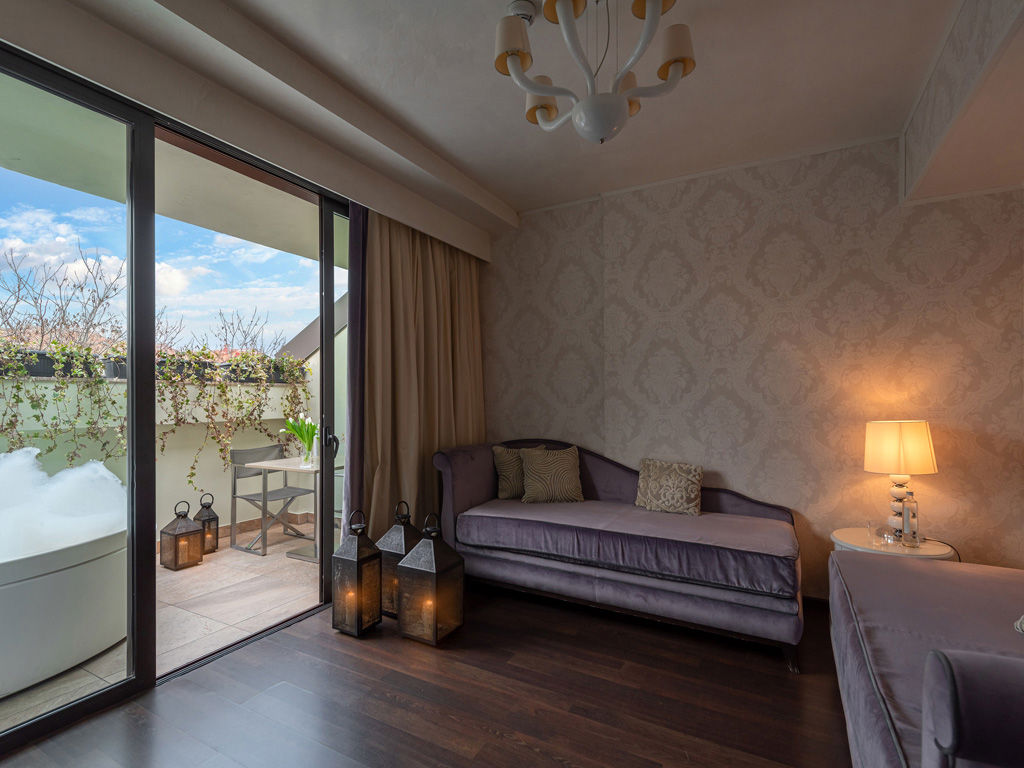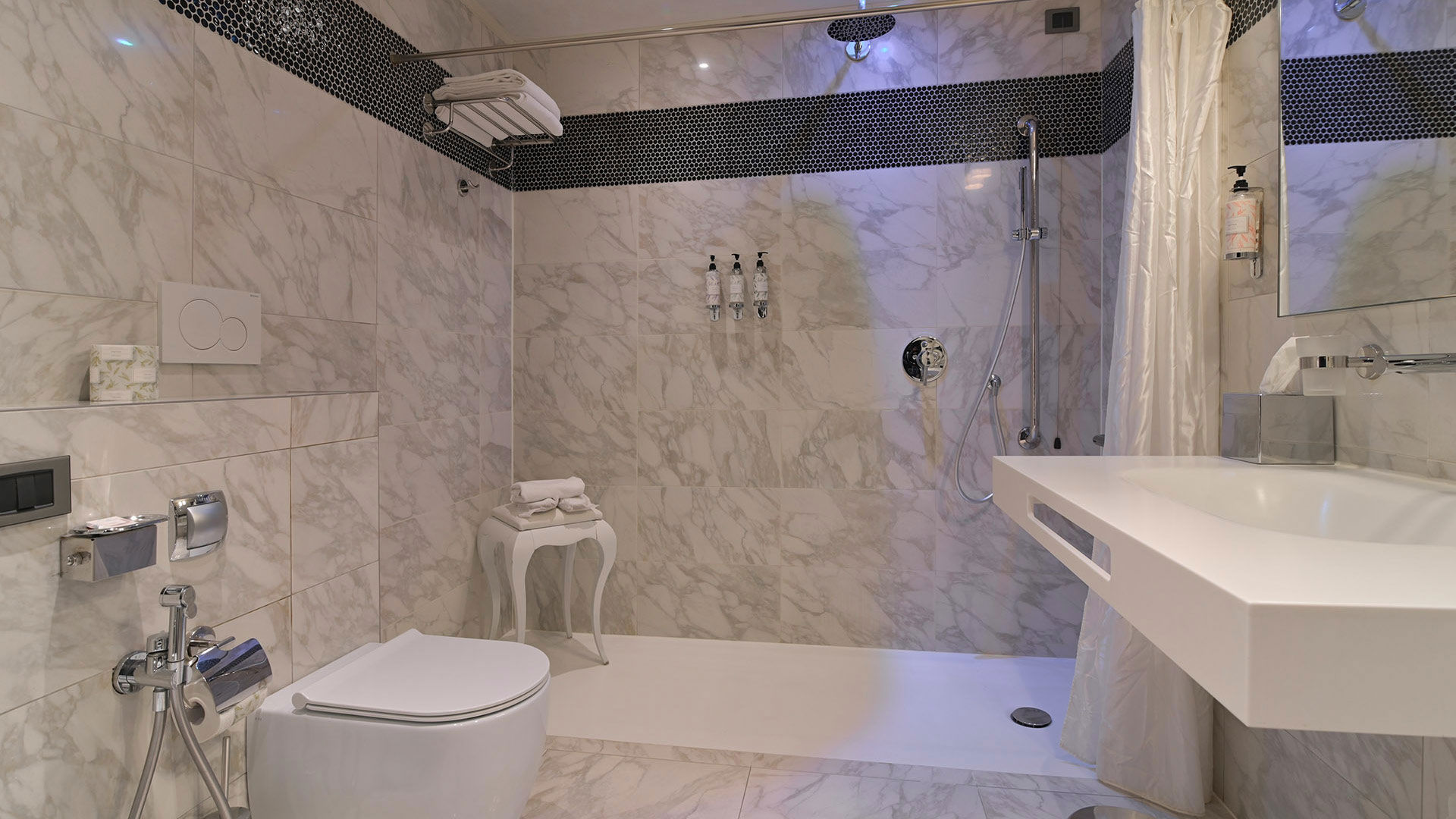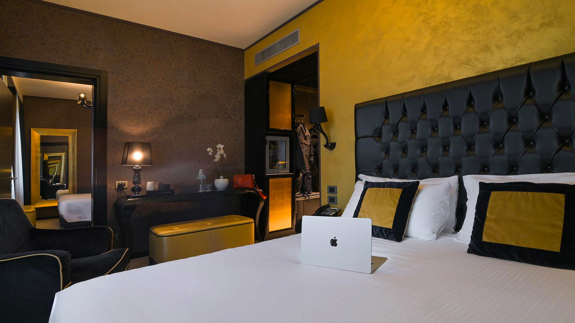 Be warmly welcomed by our exquisitely appointed and beautifully designed 20m2 rooms each. Flanked by Venetian damask walls in sensual black and gold, you will enjoy the relaxing view of our secret garden. You may choose from a queen-size bed or two twin-size beds in each room, to suit your preference. Equipped with a constant air exchange system, parquet floors and wallpaper, they guarantee your well-being and a fresh and bright luxury. Contemporary Murano Glass lamps, a writing table, a bench and an open closet surround you in a stylish yet informal atmosphere. The elegant bathroom of each room, in Calacatta Marble boasts a refreshing walk-in rain shower with chromotherapy lights and a vanity with a glittery sink in gold leaf.