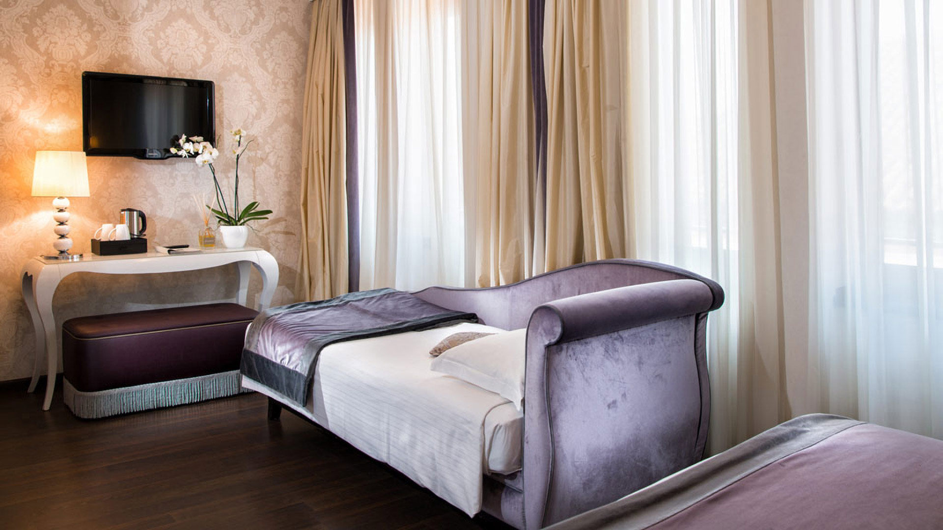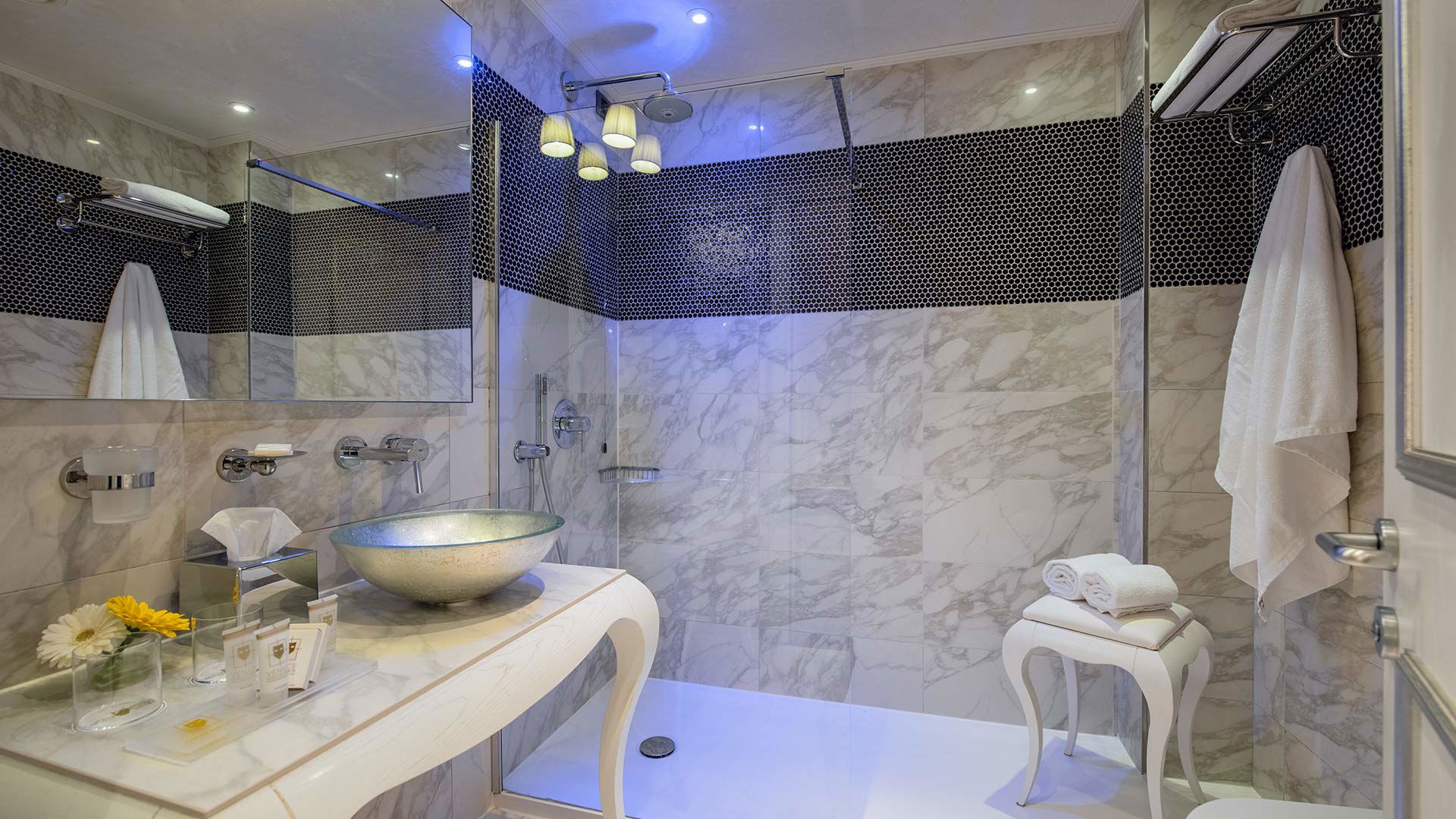 Equipped with a constant air exchange system, parquet floors and wallpaper, they guarantee your well-being and a fresh and bright luxury. Freshen up in your en-suite bathroom in elegant Calacatta Marble, with a walk-in rain shower or a Corian bath tub with chromotherapy lights. This beautiful bathroom counts also with a vanity with glittery sinks in silver or gold leaf. Being able to host up to 3 Guests, the Chaise Lounge transforms into a single bed, to allow another family member or close friend to join you.