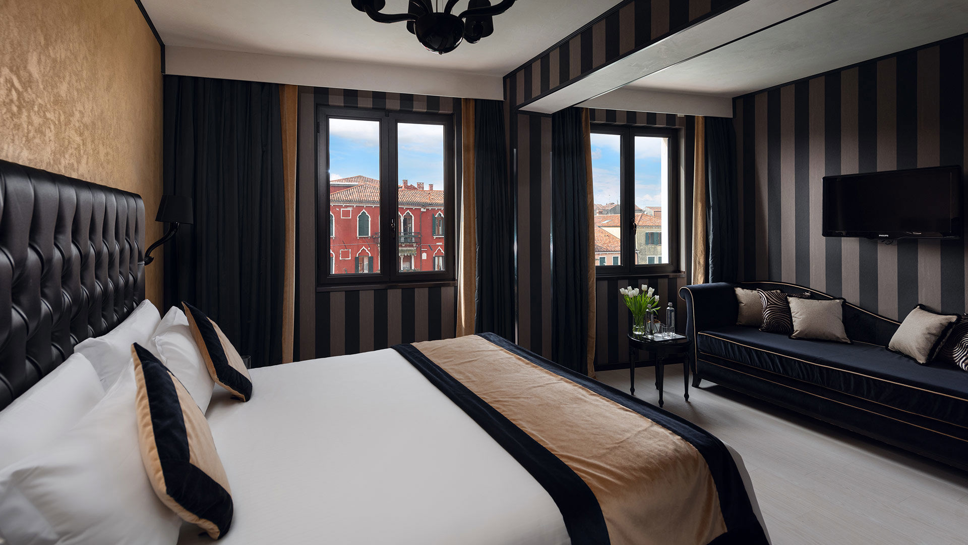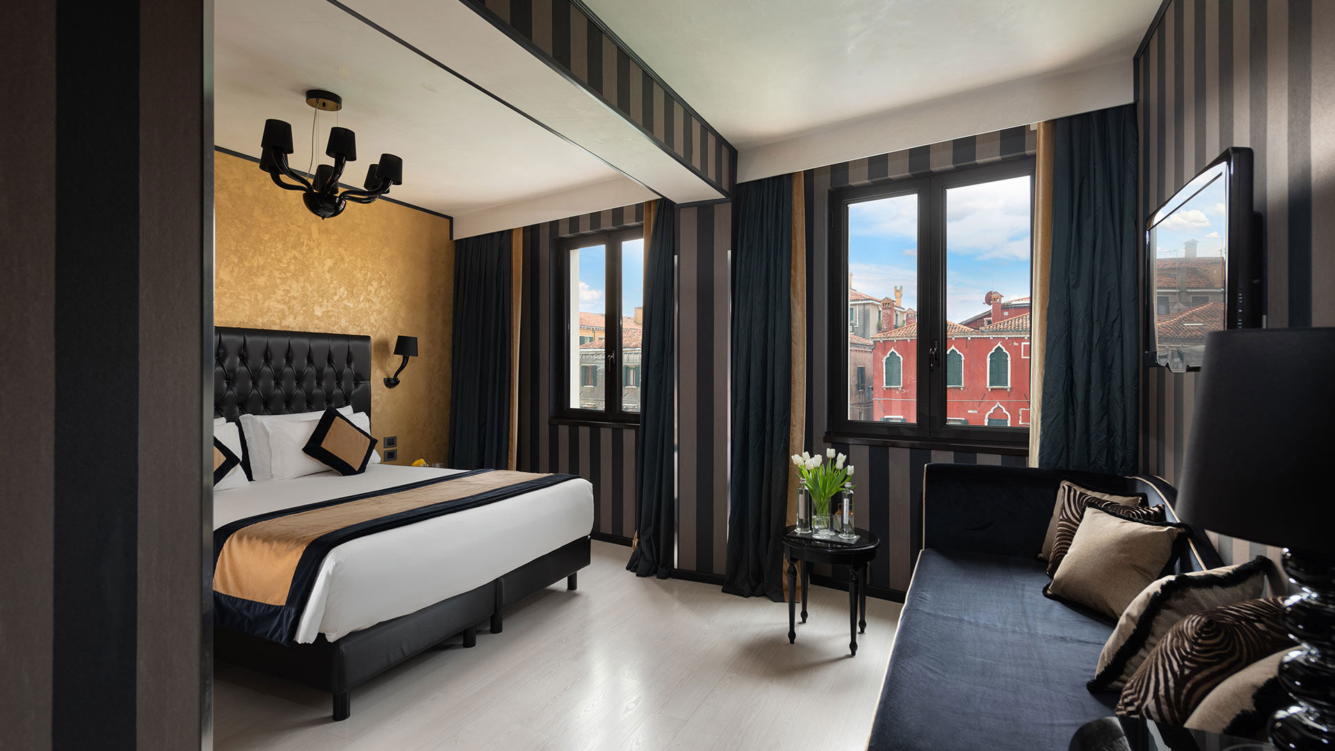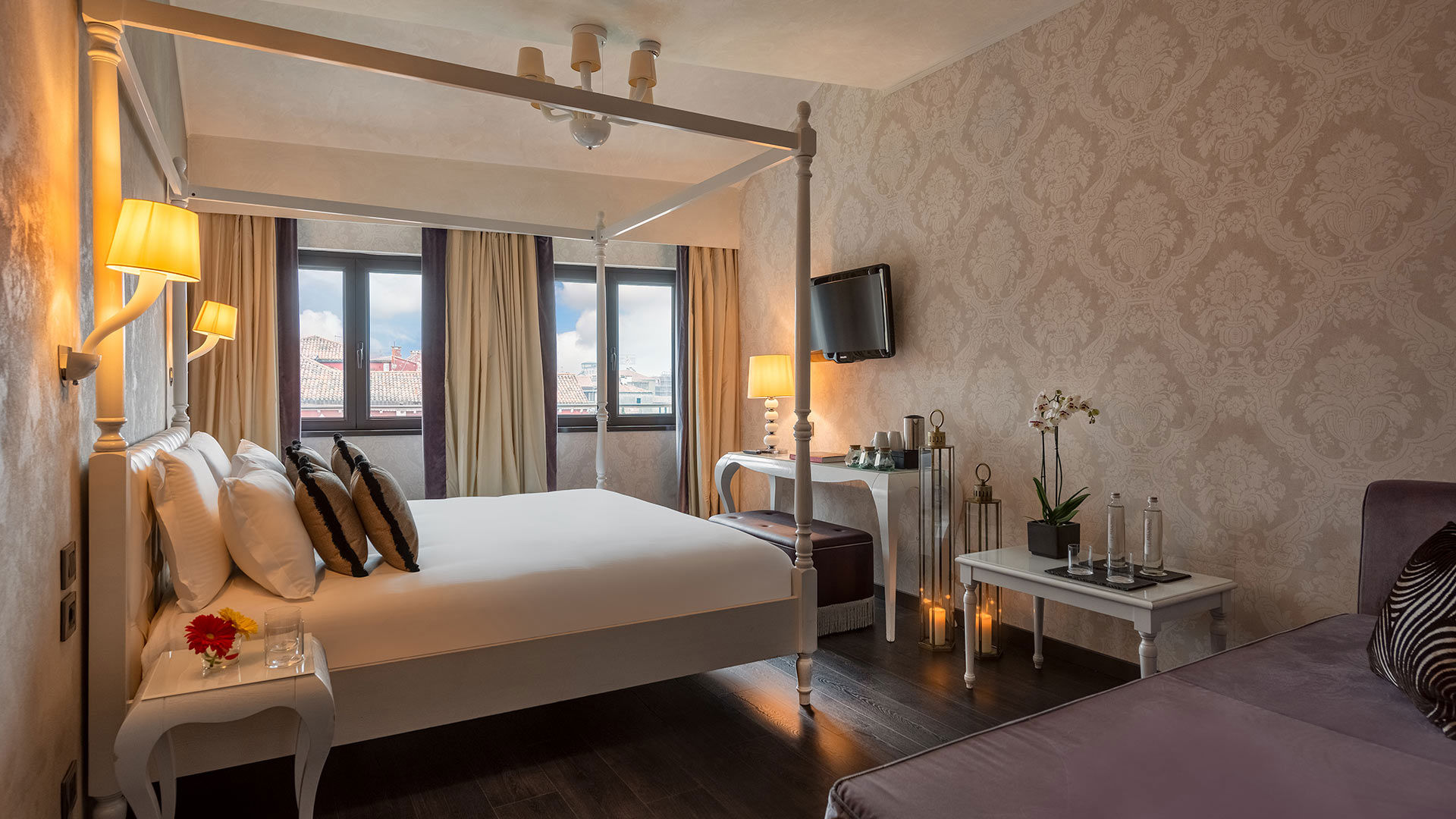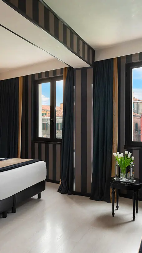Dramatic and luxurious, these rooms offer a generous layout of 30mq and sparkling canal views. Beautifully set on the first, second and third floors these prestigious rooms are perfectly perched to admire the flow of the boats on the Cannaregio Canal and the Tre Archi bridge. Exclusive and stylish, they showcase Venetian detailing in the shades of sensual black and gold or calming ivory and silver tones. You may choose from a queen-size bed, two twin-size beds or a four poster bed to suit your preference.