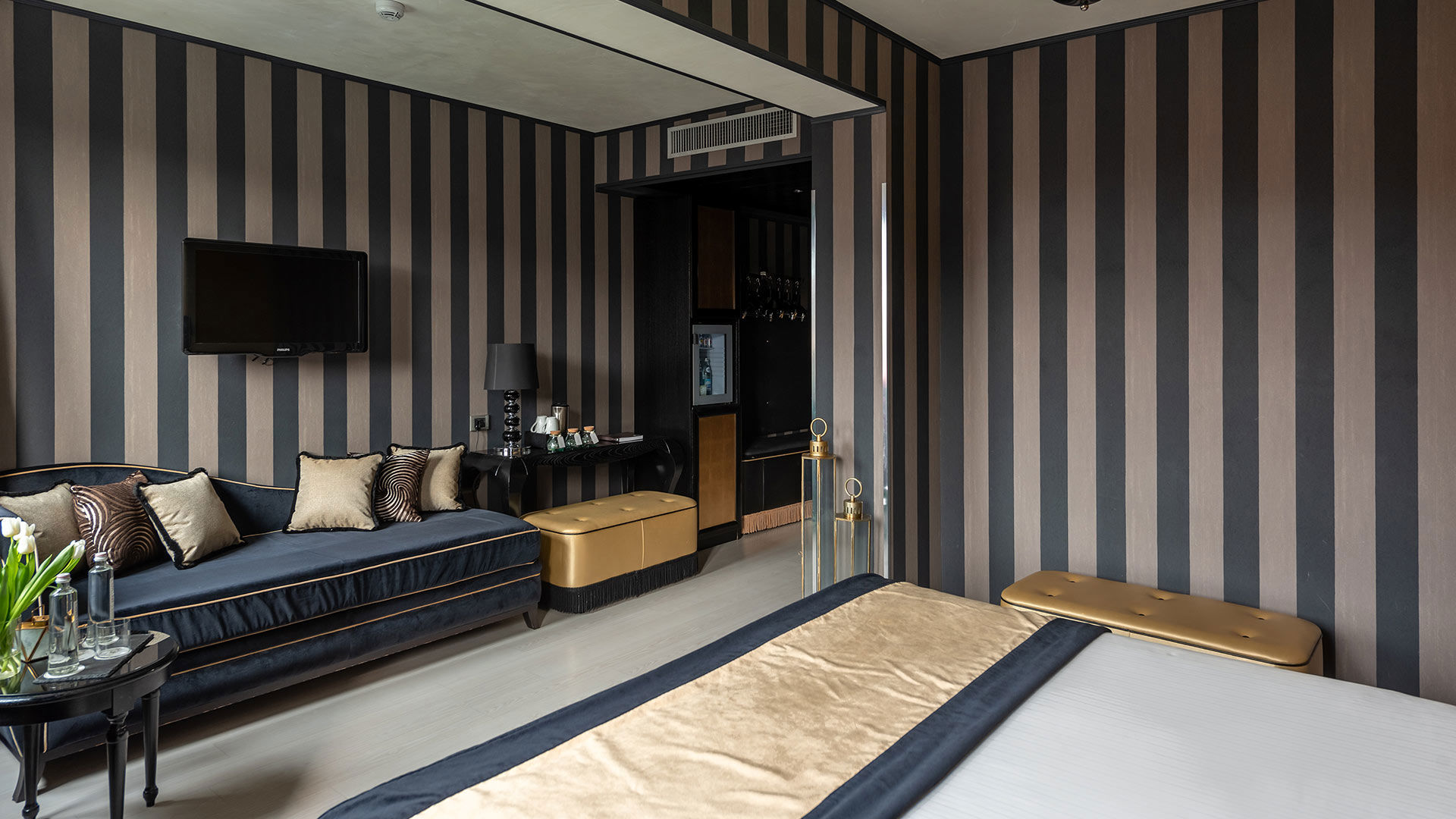 Equipped with a constant air exchange system, parquet floors and wallpaper, these fresh and bright rooms guarantee your well-being. The decor is complemented by a sumptuous chaise longue, a writing table, a bench, contemporary world-famous Murano glass lamps and a modern open closet. Cool off in your very own invigorating rain shower or take a long, leisurely soak in your separate Corian bath tub. Your elegant Calacatta Marble bathroom also boast chromotherapy lights and a vanity with glittery sinks in silver or gold leaf. Being able to host up to 3 Guests, the Chaise Lounge transforms into a single bed, to allow another family member or close friend to join you.