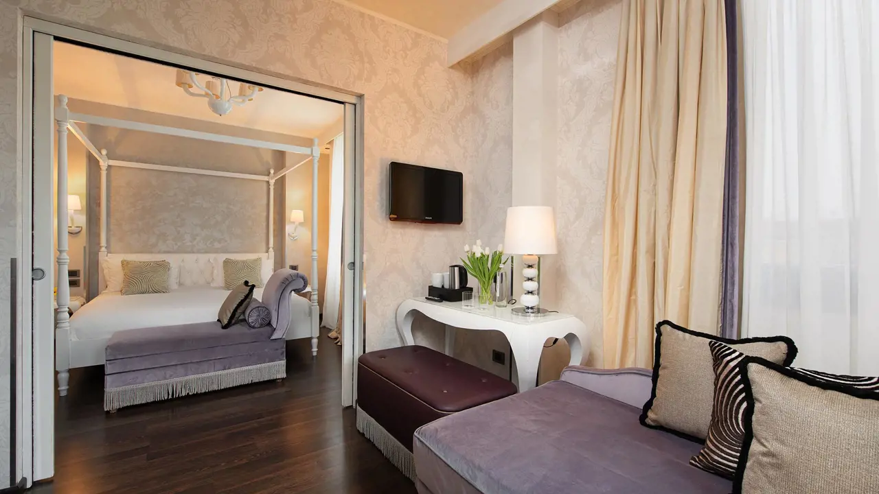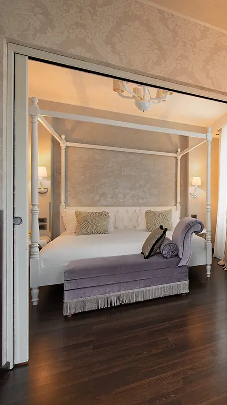 Ignite your soul with a stay in our spacious garden view Suites. Secluded and enveloped by the greenery of our lush, secret garden, these comfortable and relaxing 35m2 Suites showcase beautiful contemporary Venetian decoration in sensual black and gold, lavish aubergine or calming ivory and silver tones. Central to the Venetian experience is the dramatic four-poster bed. Two elegant sliding doors open to reveal your living room area complete with writing table, a smaller table, modern lighting in world-famous Murano-glass, a magnificent chaise longue and a plush armchair.