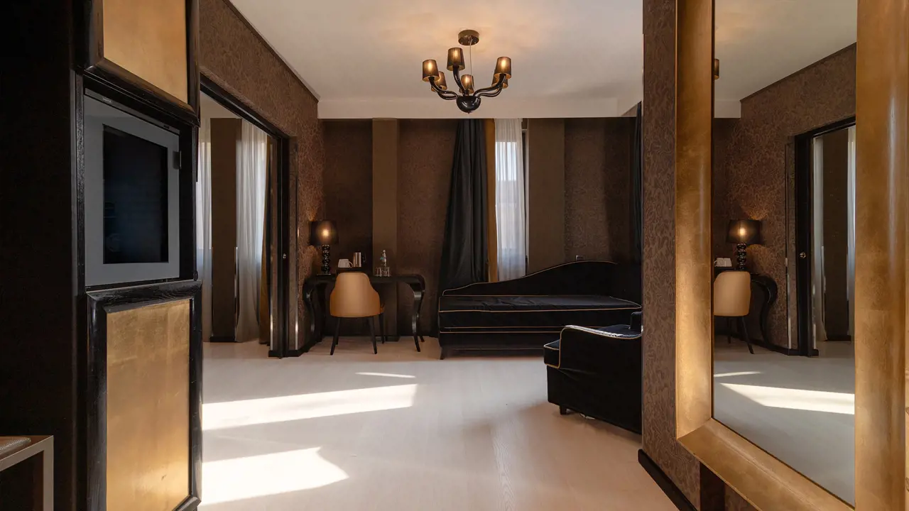 Equipped with a constant air exchange system, parquet floors and wallpaper, they guarantee your well-being as well as fresh and bright luxury. Freshen up in your en-suite Calacatta marble bathroom, taking advantage of the walk-in rain shower or luxury Corian bath tub. Your beautiful bathroom also comes with chromotherapy lights and a twin vanity with glittery sinks in silver or gold leaf. Our Suite counts with ample additional space to add up to 2 more people to enjoy the stay with you transforming the chaise longue into a single bed and adding 1 rollaway bed.