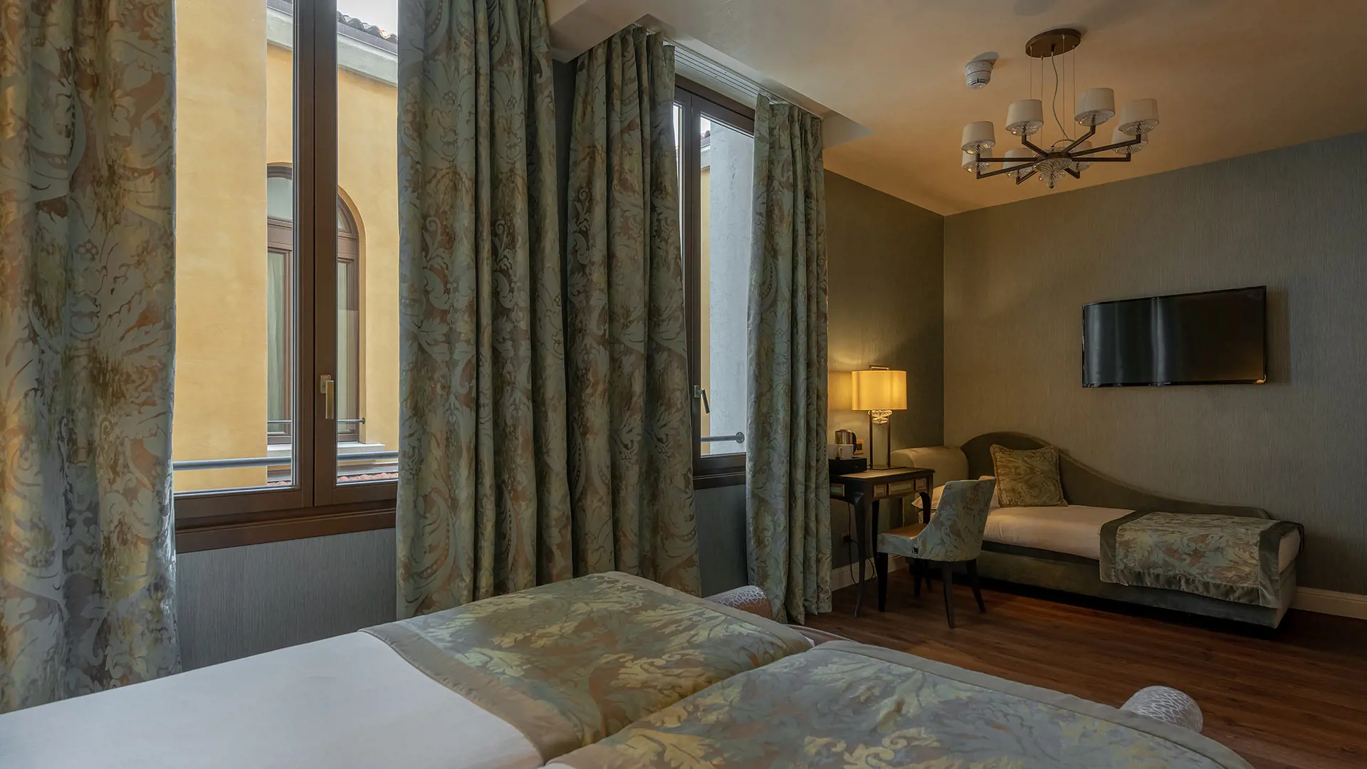 Performing a contemporary Venetian design in ivory, aqua or black tones, all bedrooms offer a Queen-size or two twin-size beds or a four-poster bed available upon request. Featuring a chaise longue that transforms into a single bed, this room can host up to 3 Guests.