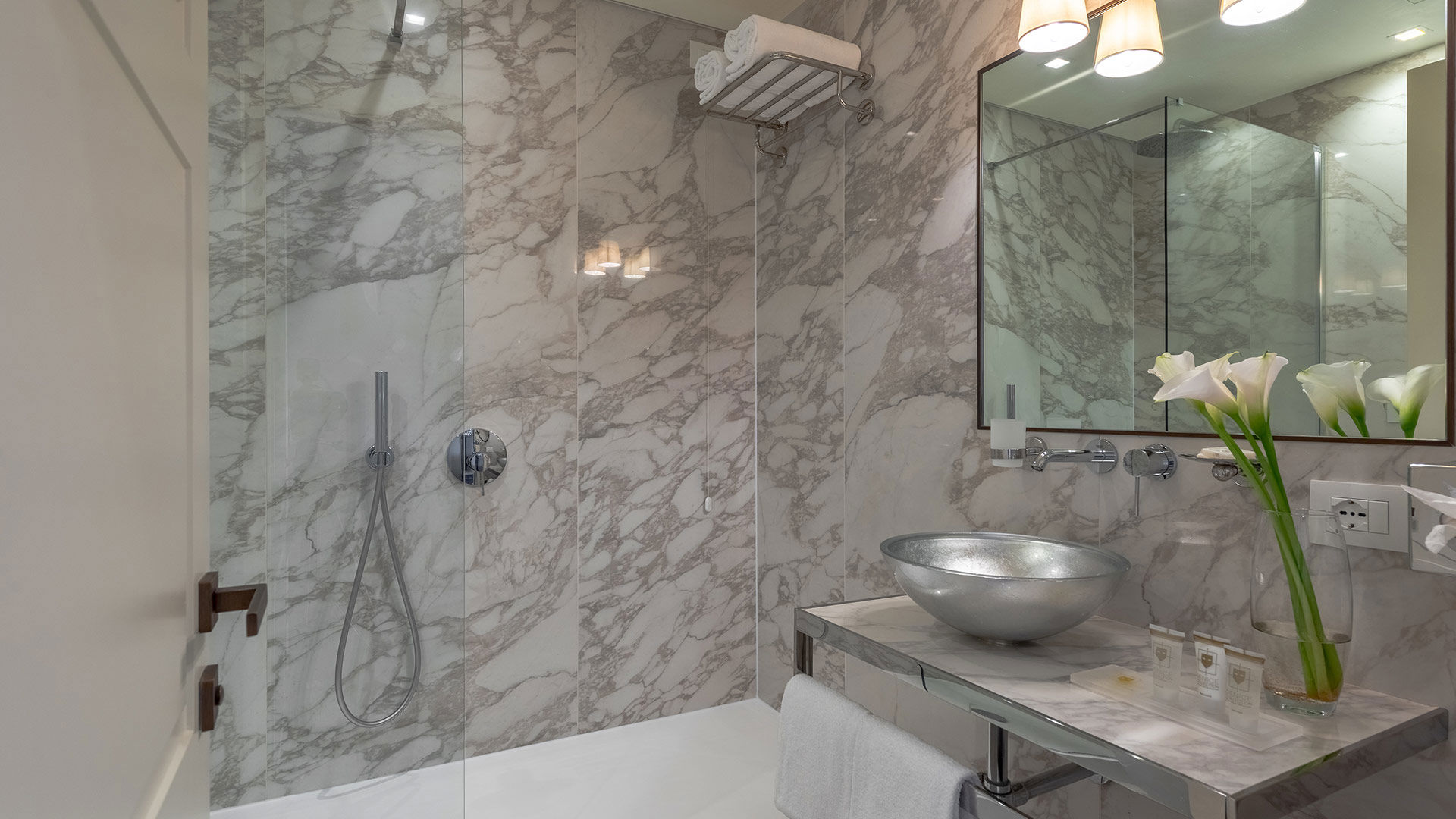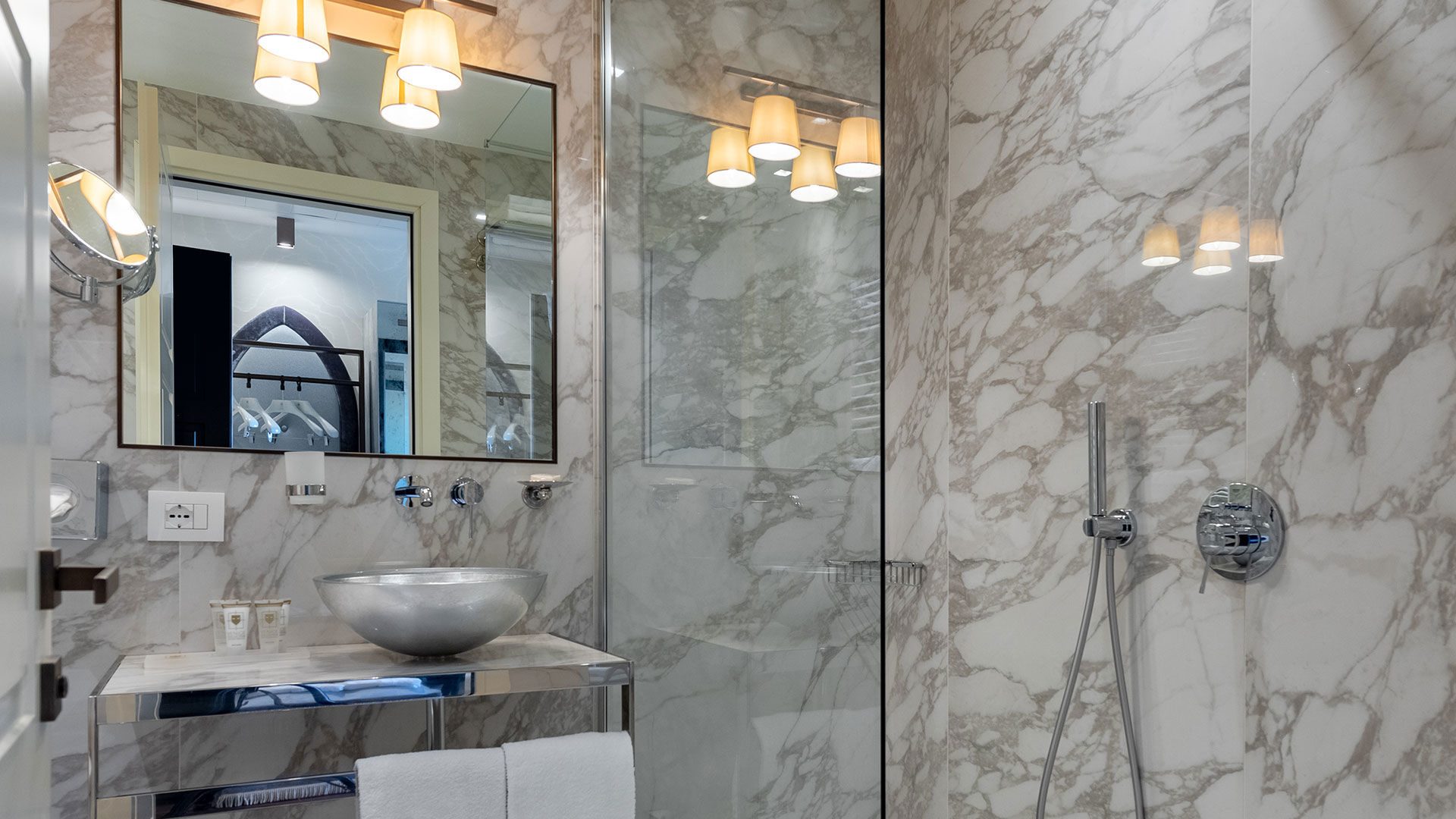 The bathroom, in Calacatta Marble offers a walk-in shower in Corian. Chromotherapy lights and a vanity with a glittery sink in gold leaf complement the exceptional splendor within.