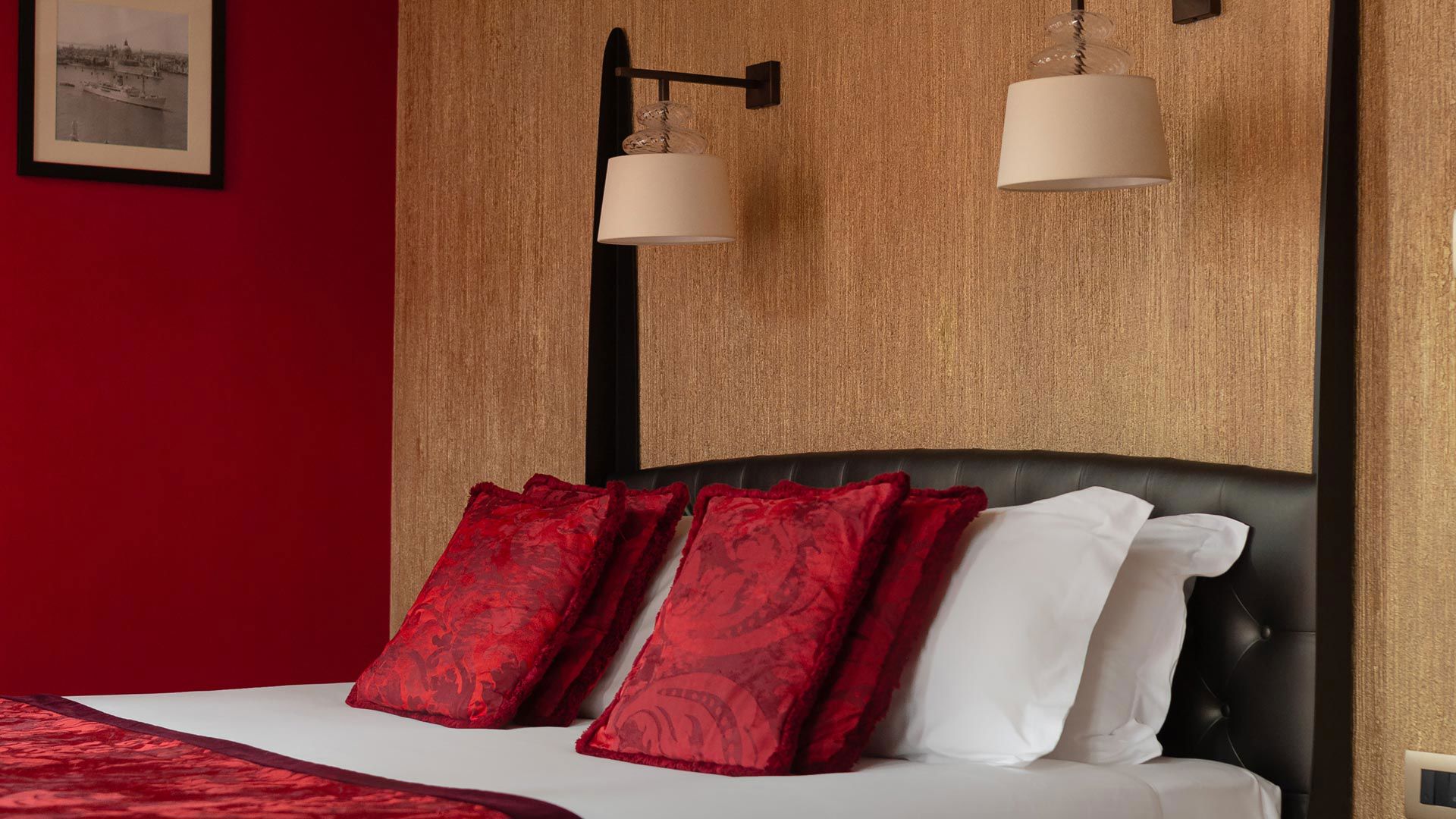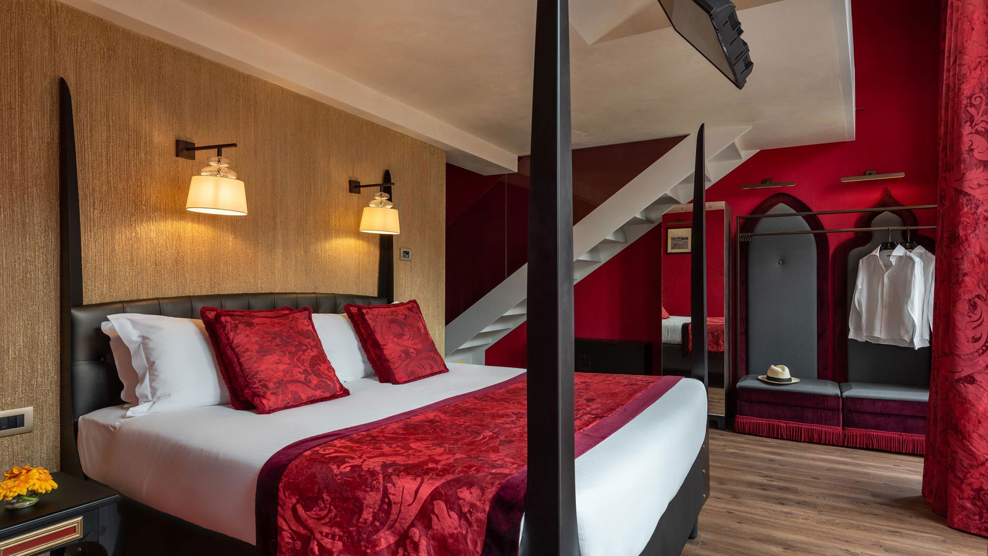 Allow yourself an exclusive level of romance in this fascinating 2 floors indulgent space, beautifully designed with authentic Venetian damasks in ivory or red tones. This elegant Suite of 43 m2 features a bedroom fully equipped with a writing table, a chair, a bench, an open closet and a magnificent Queen-size bed on the bottom floor.