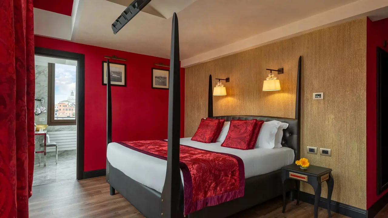 You may choose from a double bed or two twin-size beds or a four-poster bed, to suit your preference. This unique Suite , illuminated with Murano Glass lamps, boasts a freestanding Jacuzzi on the upper level and is perfectly located to admire the quiet flow of boats and gondolas of the small Ognissanti canal.
