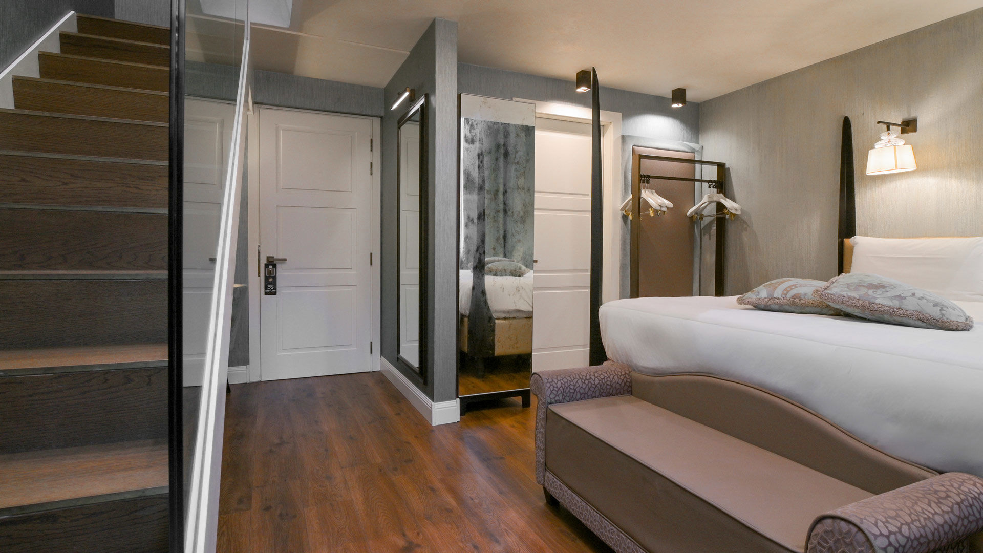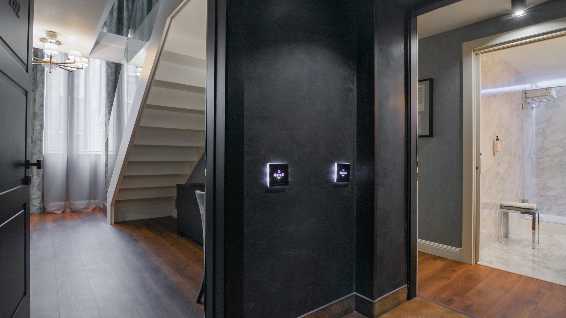 The Suite, perfectly located to soak a lushly green garden view, offers a fully equipped bedroom with a magnificent four-poster Queen-size bed on the bottom floor, a bathroom in Calacata Marble with a walk-in rain shower, Chromotherapy lights and a vanity with a glittery sink in gold leaf. The stairs reveal a second bedroom on the upper floor, featuring 2 twin beds or 1 queen size bed, a second closet and a small bathroom.