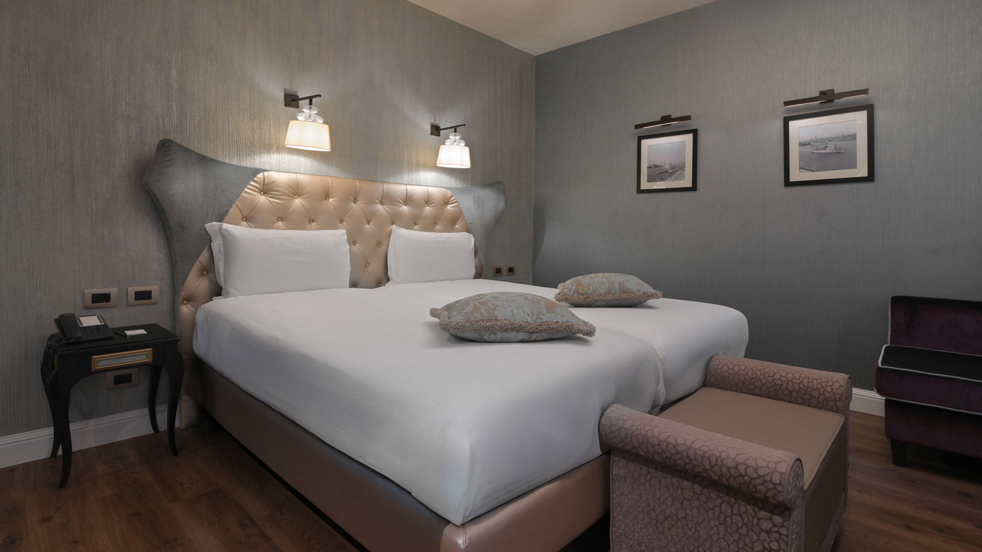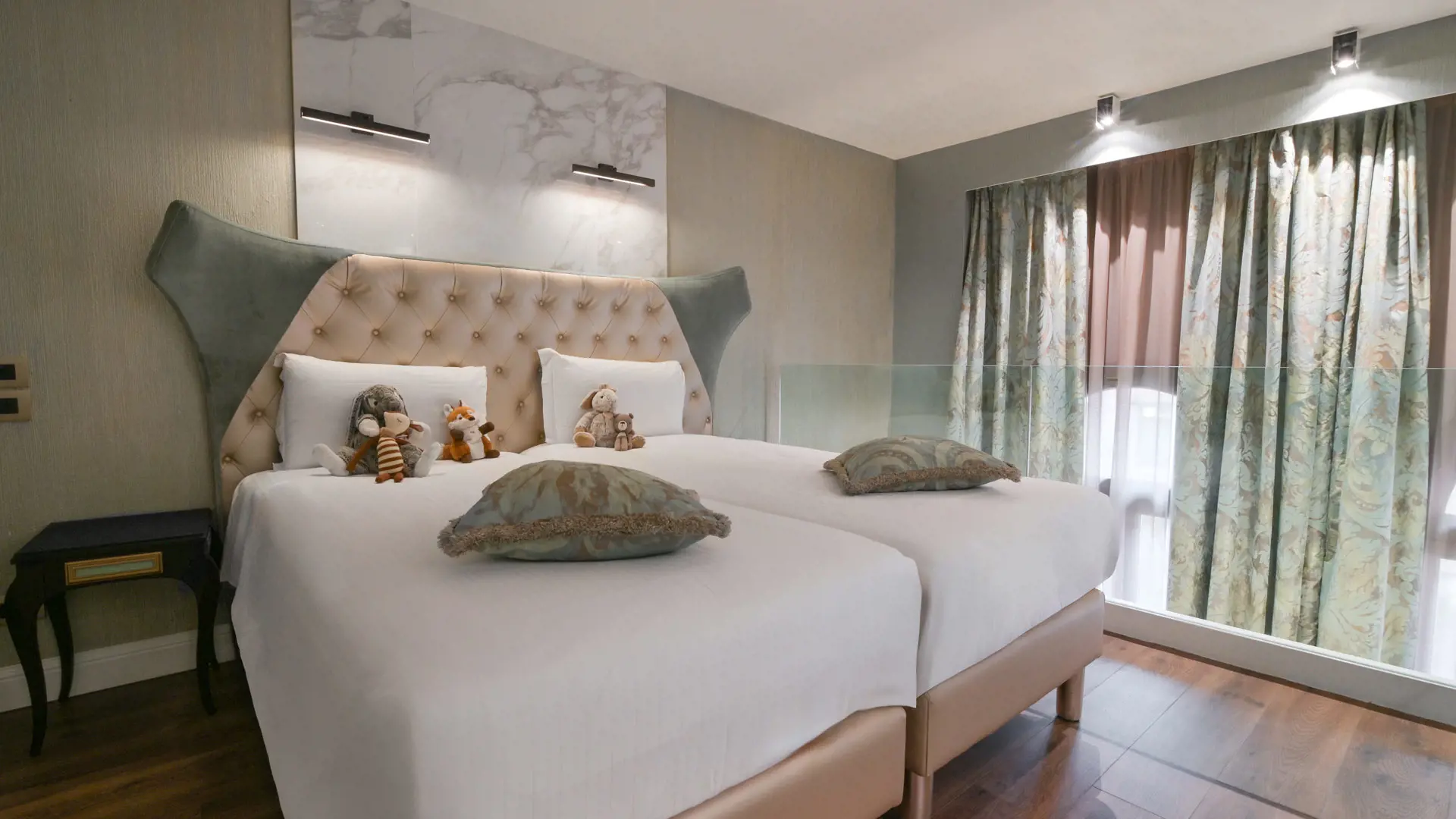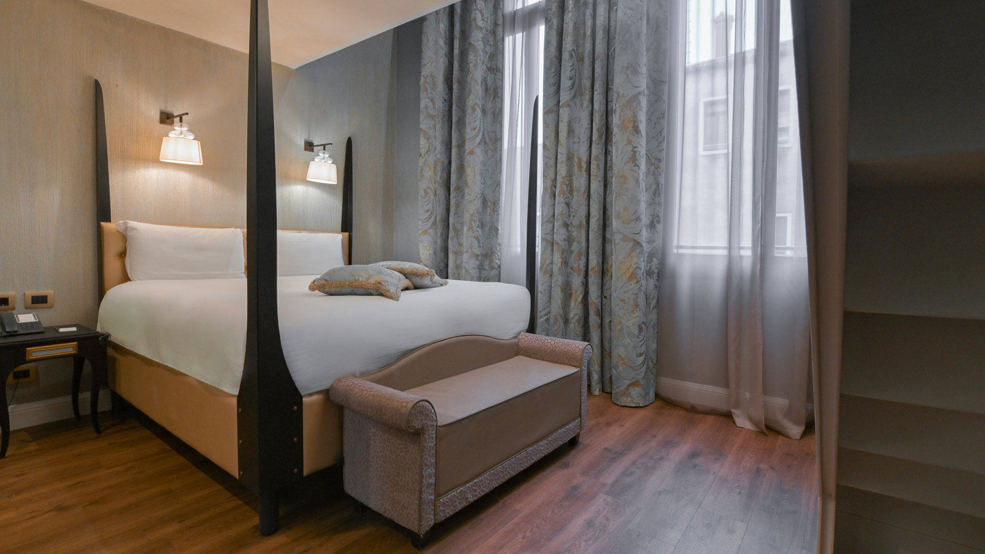 The double room overlooks our private courtyard and offers either a double bed or 2 twins beds, to suit your preferences. This room also counts with it’s own bathroom, in elegant Calacatta Marble, offering a walk-in rain shower, Chromotherapy lights and a vanity with a glittery sink in gold leaf. Parquet floors grant you extra comfort while Murano Glass lamps, a writing table, an open closet and a bench surround you in a luxurious yet informal atmosphere per room.