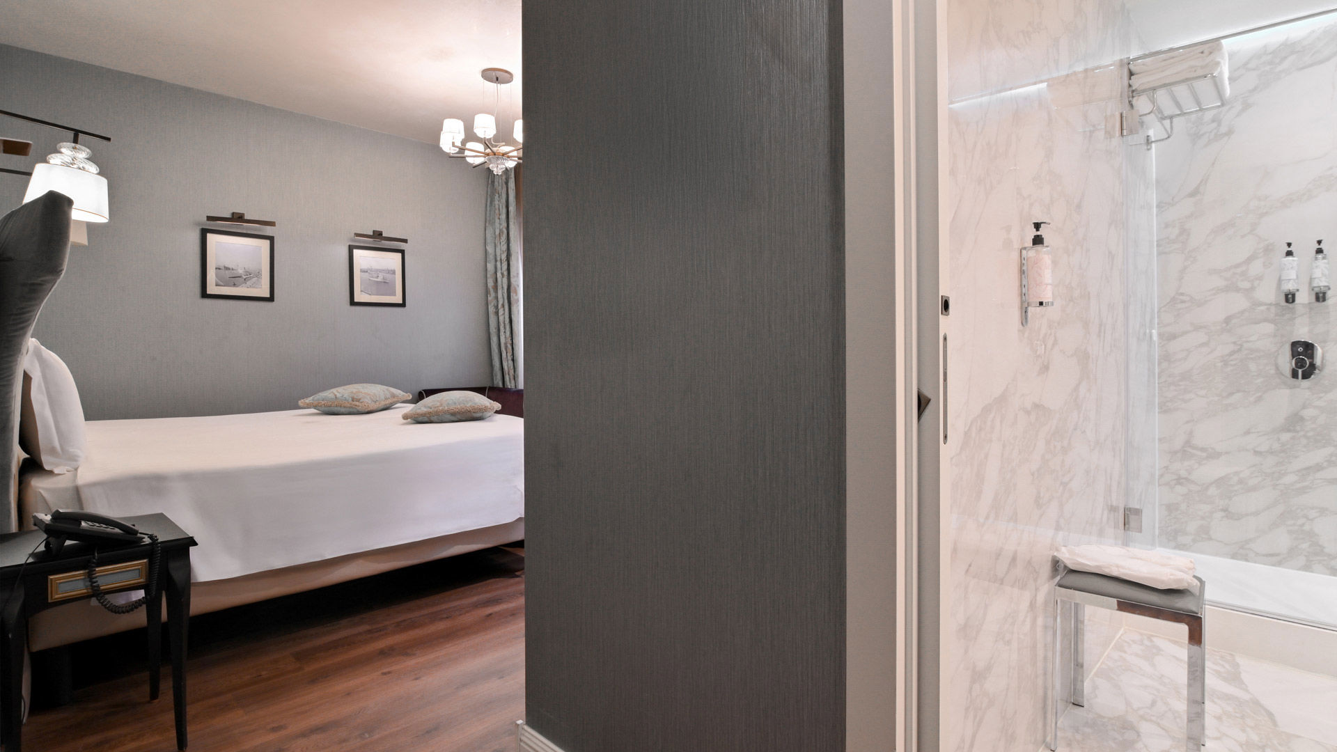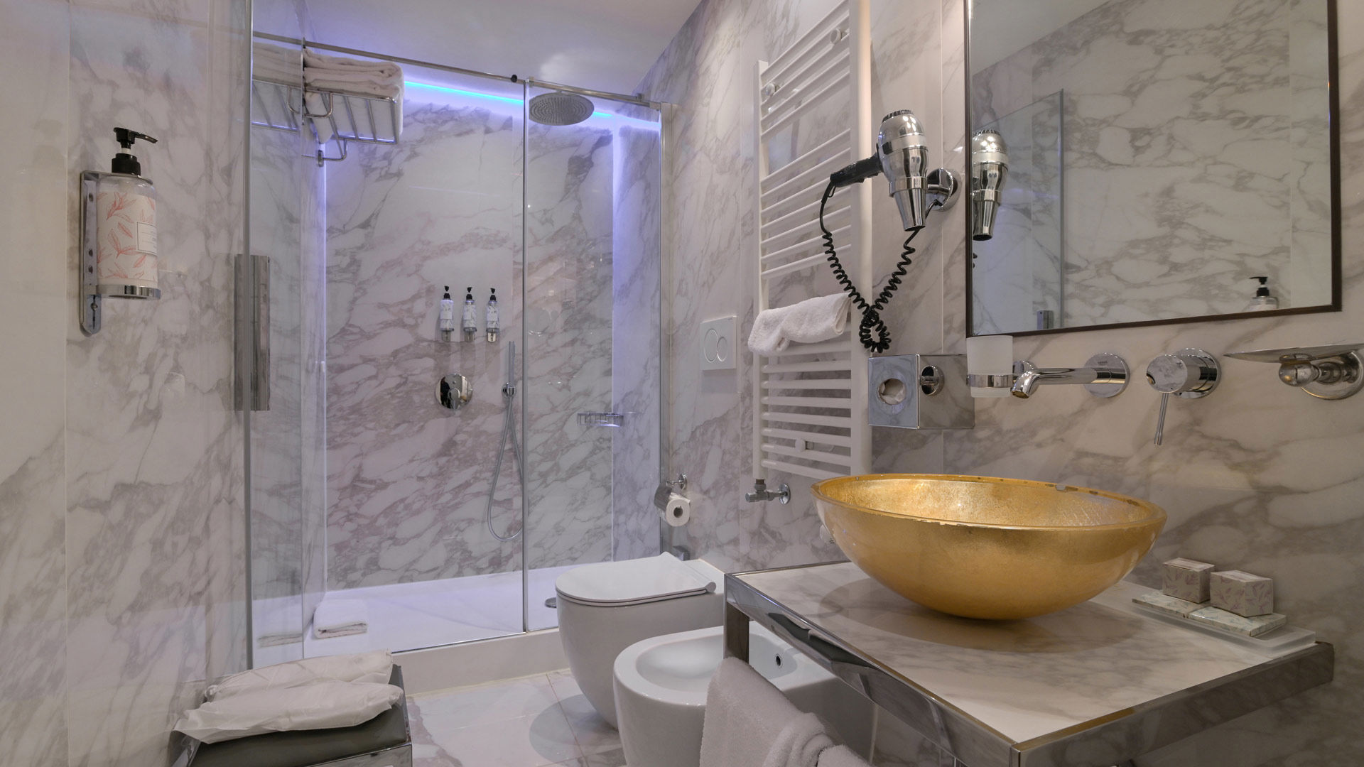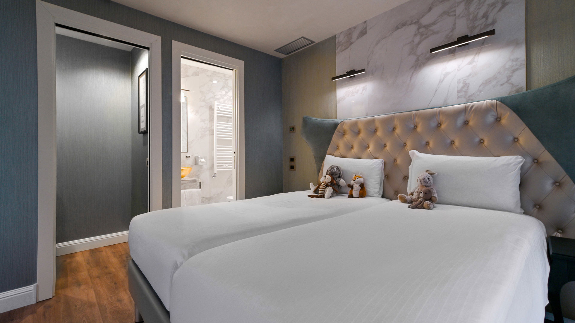 The double room overlooks our private courtyard and offers either a double bed or 2 twins beds, to suit your preferences. This room also counts with it’s own bathroom, in elegant Calacatta Marble, offering a walk-in rain shower, Chromotherapy lights and a vanity with a glittery sink in gold leaf. Parquet floors grant you extra comfort while Murano Glass lamps, a writing table, an open closet and a bench surround you in a luxurious yet informal atmosphere per room.