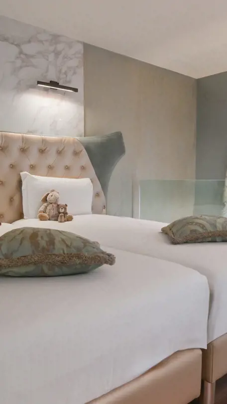 Large families will enjoy the homely feeling this combination of rooms showcase, with a magnificent surface of 66 m2 exquisitely appointed in aqua tones. Nestled on the 2nd floor you will find a suite on 2 levels located right next to a double room and connected through each other by an inner door.