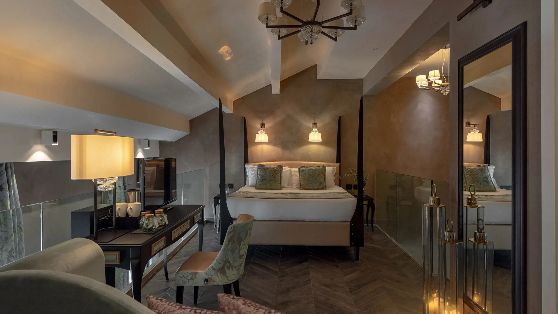 Representing the ultimate private in-house relaxation – get immersed in your own sanctuary as soon as you step into this welcoming and sophisticated Suite of 70 m2. The spotlights of a corridor will lead you into a magnificent two level space beautifully decorated in calming aqua tones with Venetian fabrics, damasks and lamps in world-famous Murano glass.