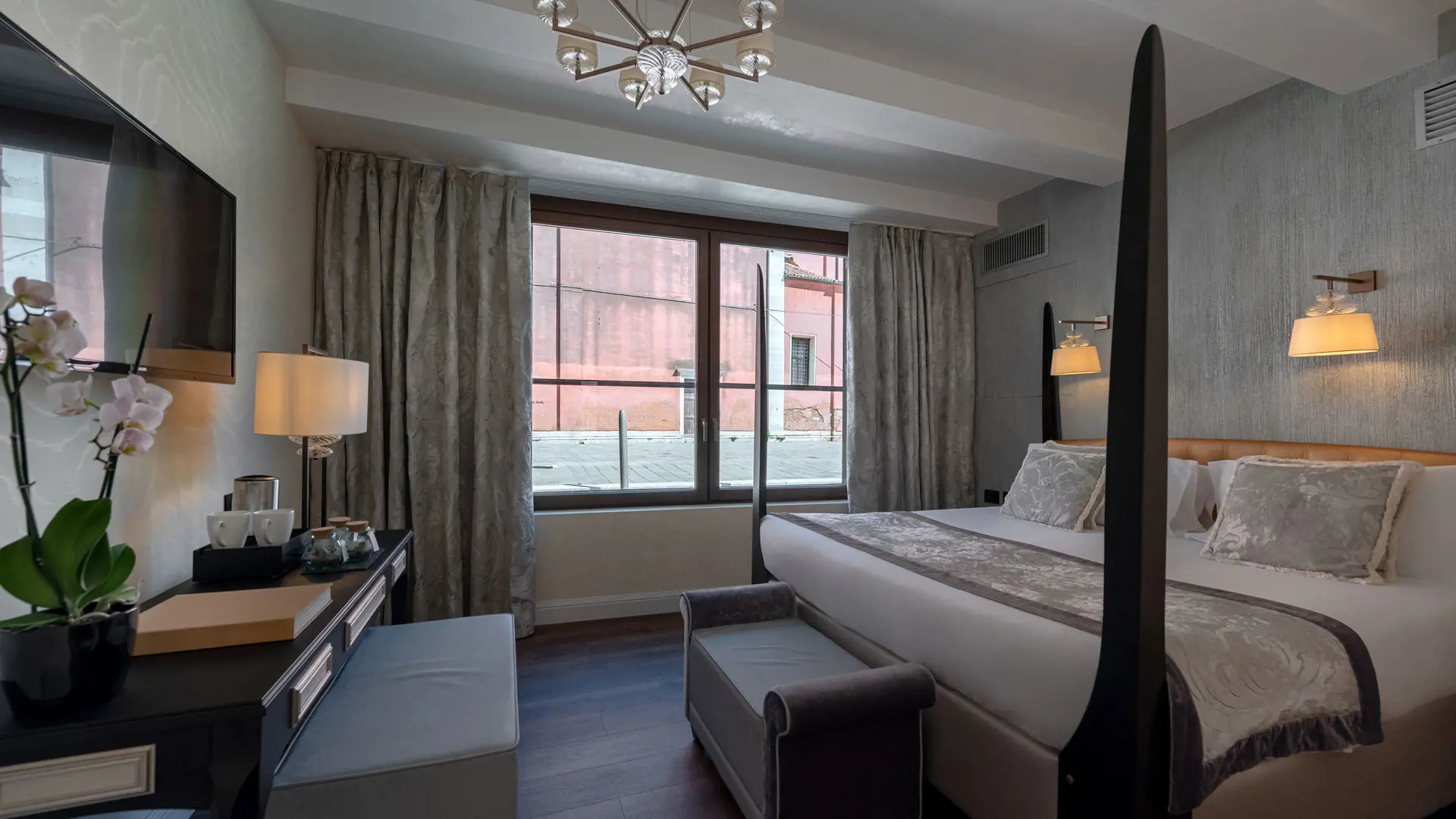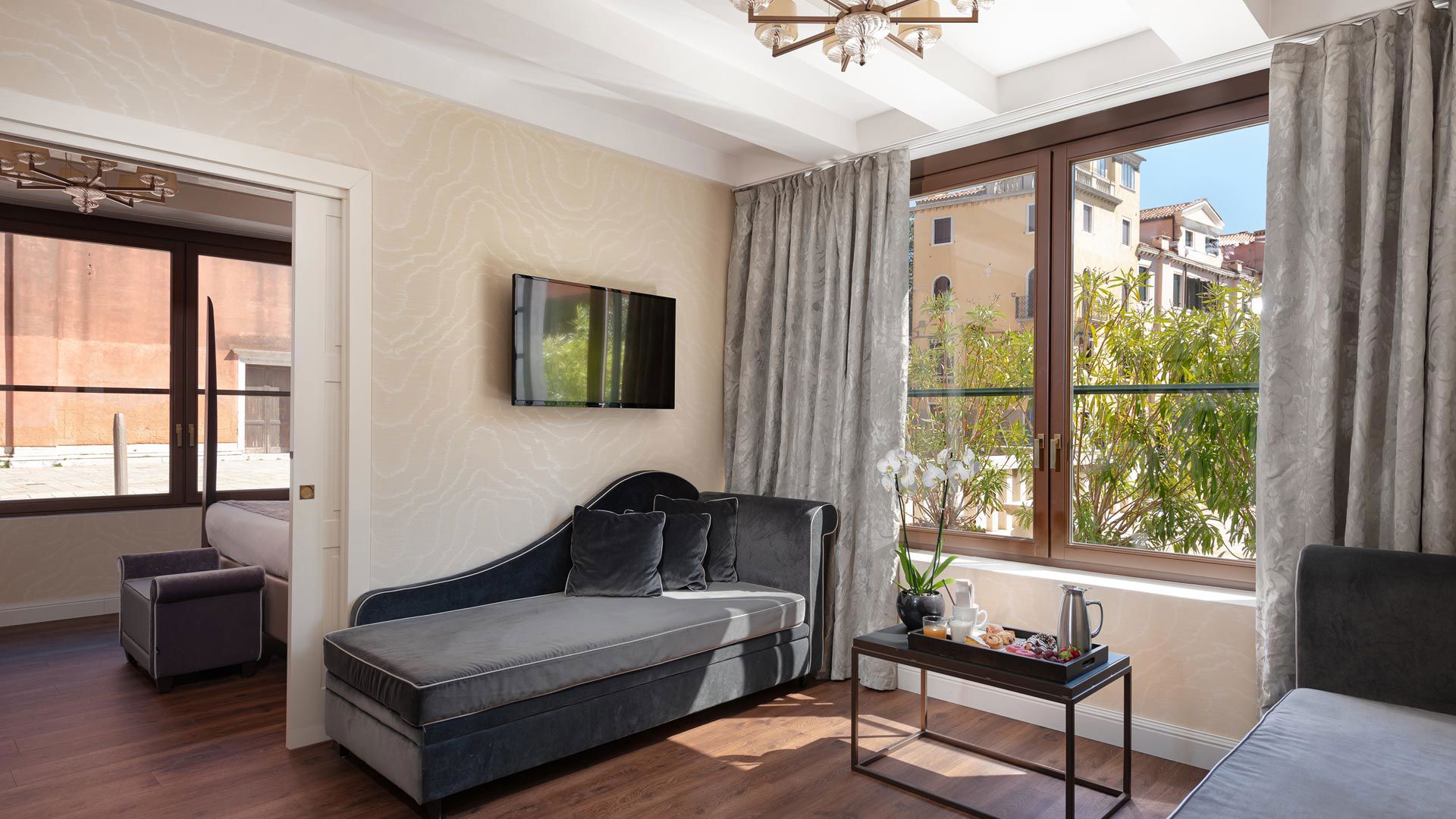 They have a total area of 36m2, with a living area with table, chair, pouf and chaise longue, and are the ideal choice for a family stay. Murano glass chandeliers, parquet floors and Venetian damask complement the elegant ambience, while the wardrobe adds a touch of modernity. Available with Queen size queen bed.