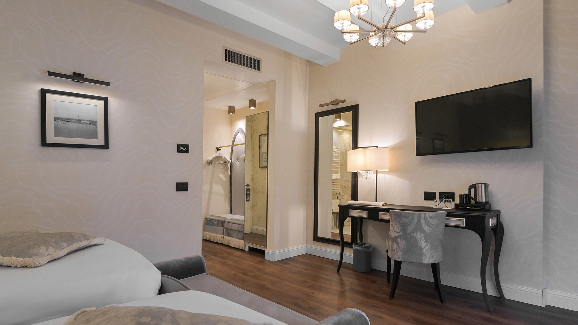Beautifully set on the ground and first floors this prestigious rooms are perfectly perched to admire the quiet flow of boats and gondolas on the small Ognisanti canal.