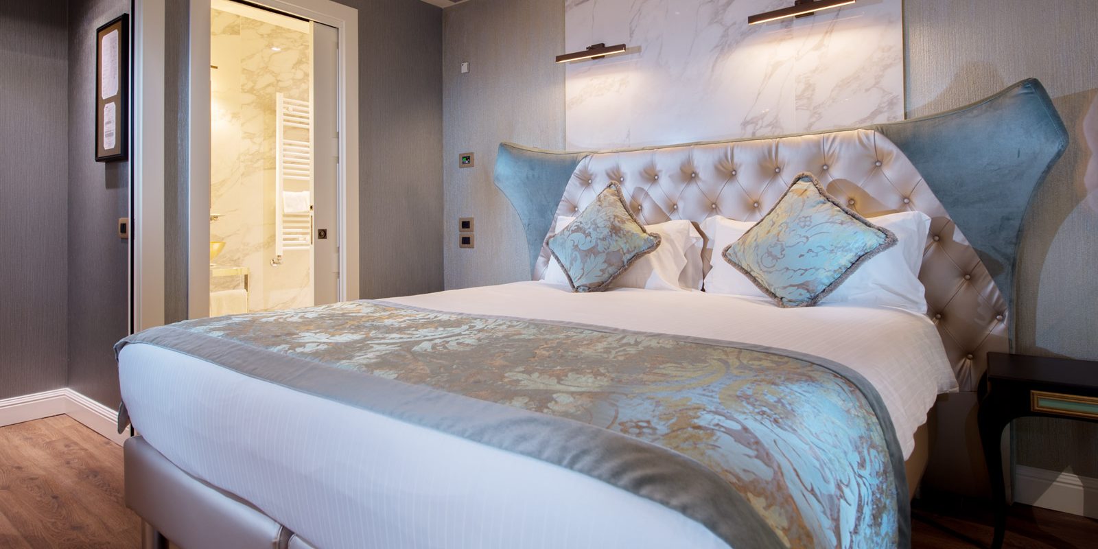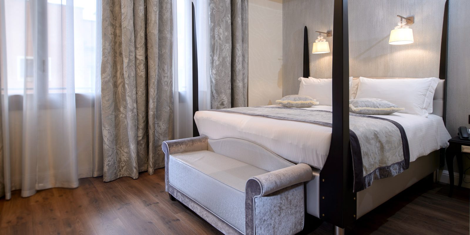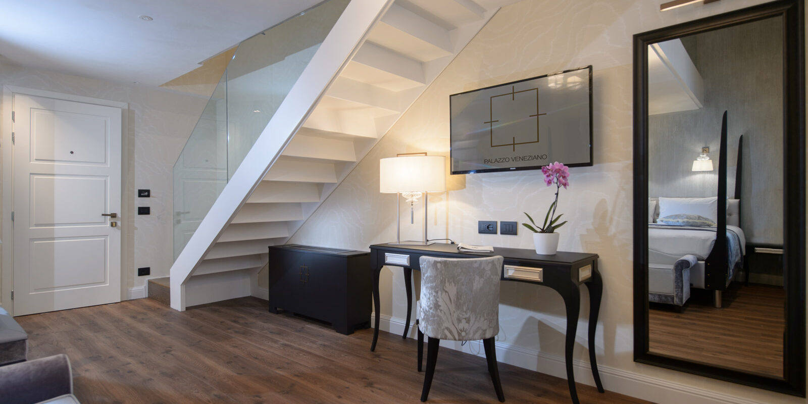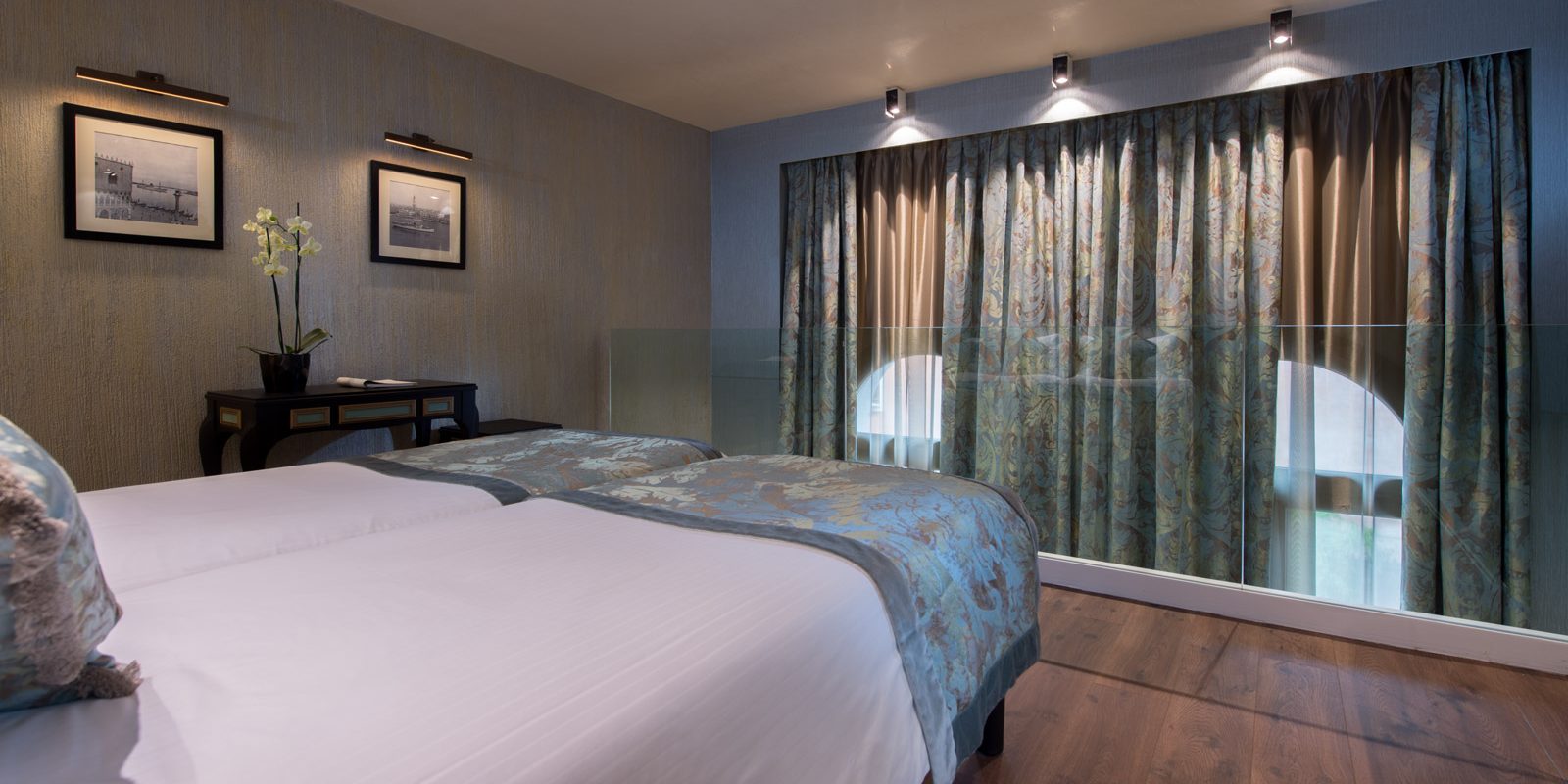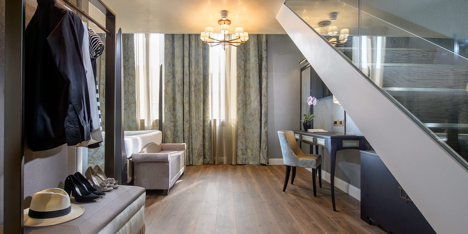 Large families will enjoy the homely feeling this combination of rooms showcase, with a magnificent surface of 66 mq exquisitely appointed in aqua tones. Nestled on the 2nd floor you will find a suite on 2 levels located right next to a double room and connected through each other by an inner door. The Suite, perfectly located to soak a lushly green garden view, offers a fully equipped bedroom with a magnificent four-poster Queen-size bed on the bottom floor, a bathroom in Calacata Marble with a walk-in rain shower, Chromotherapy lights and a vanity with a glittery sink in gold leaf. The stairs reveal a second bedroom on the upper floor, featuring 2 twin beds or 1 queen size bed, a second closet and a small bathroom. The double room overlooks our private courtyard and offers either a double bed or 2 twins beds, to suit your preferences. This room also counts with it’s own bathroom, in elegant Calacatta Marble, offering a walk-in rain shower, Chromotherapy lights and a vanity with a glittery sink in gold leaf. Parquet floors grant you extra comfort while Murano Glass lamps, a writing table, an open closet and a bench surround you in a luxurious yet informal atmosphere per room. The Connecting Family can host up to 6 Guests.