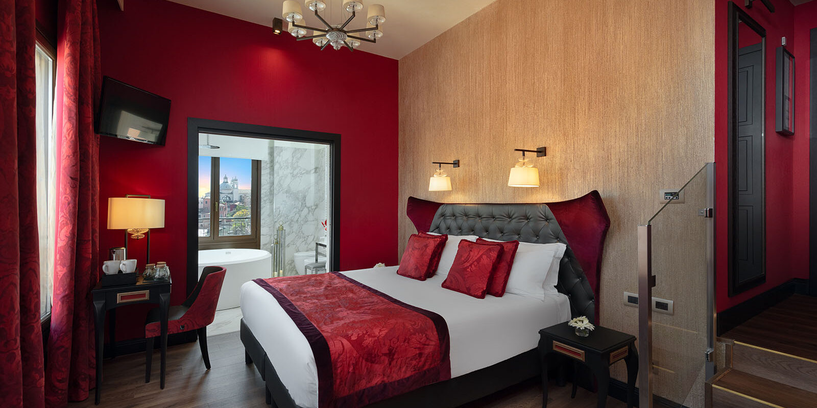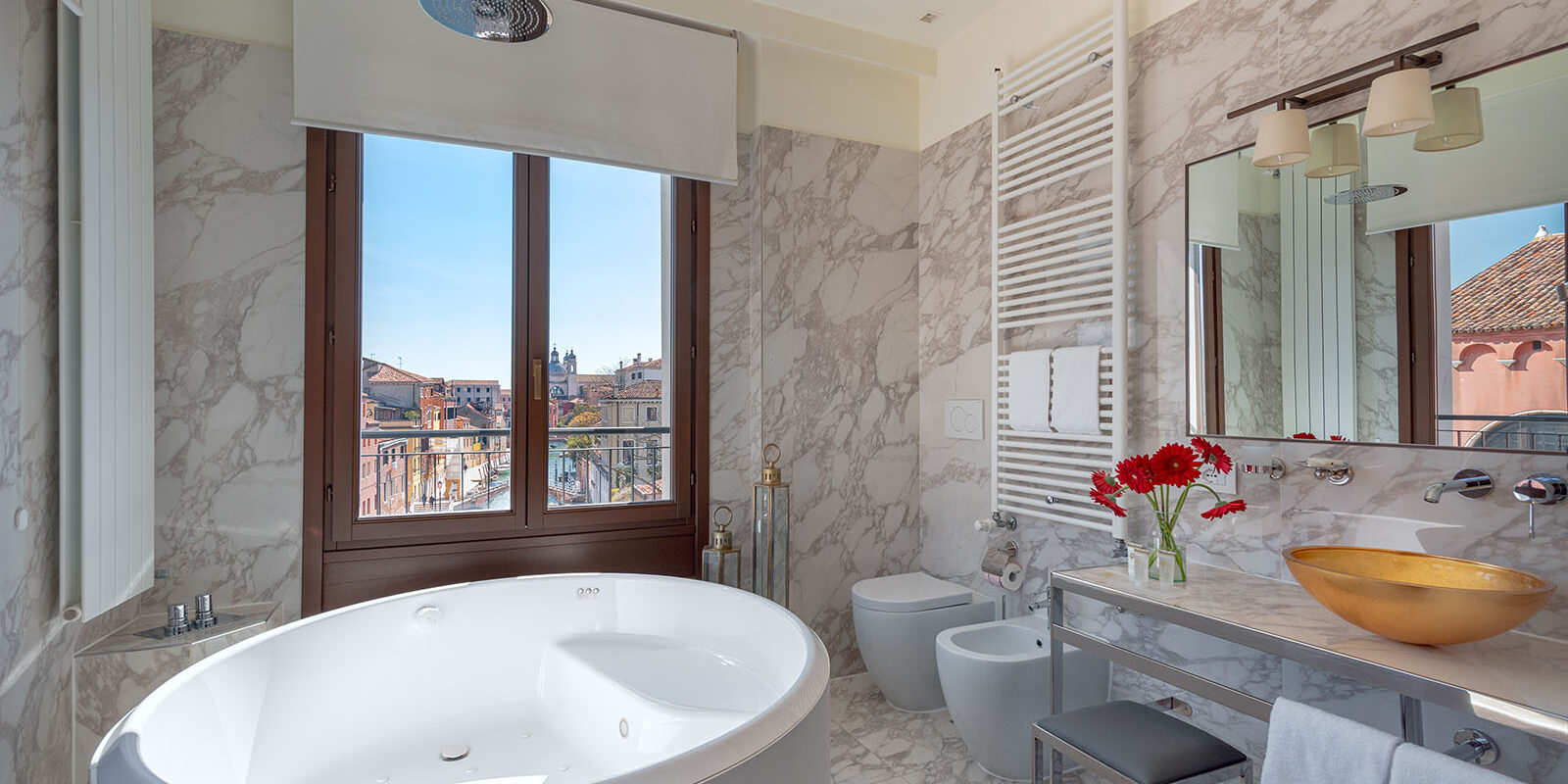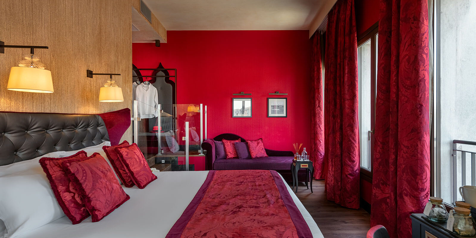 Romántica y lujuriosa, sensualmente diseñada de rojo pasional o con extravagantes tonos negros, estas estilizadas junior suites de 30 m² ofrecen unas fascinantes vistas de Venecia desde sus seductores Jacuzzi situados en un ángulo panorámico de la Suite. Telas venecianas combinadas, lámparas de cristal de Murano y suelos de parqué, las junior suites se completan con una mesa de escritorio, una silla, un chaise longue y un armario abierto. Disponible con una cama matrimonial o 2 camas gemelas. El baño de Mármol de Calacatta cuenta con Cromoterapia y un tocador con un reluciente lavabo de lámina dorada.