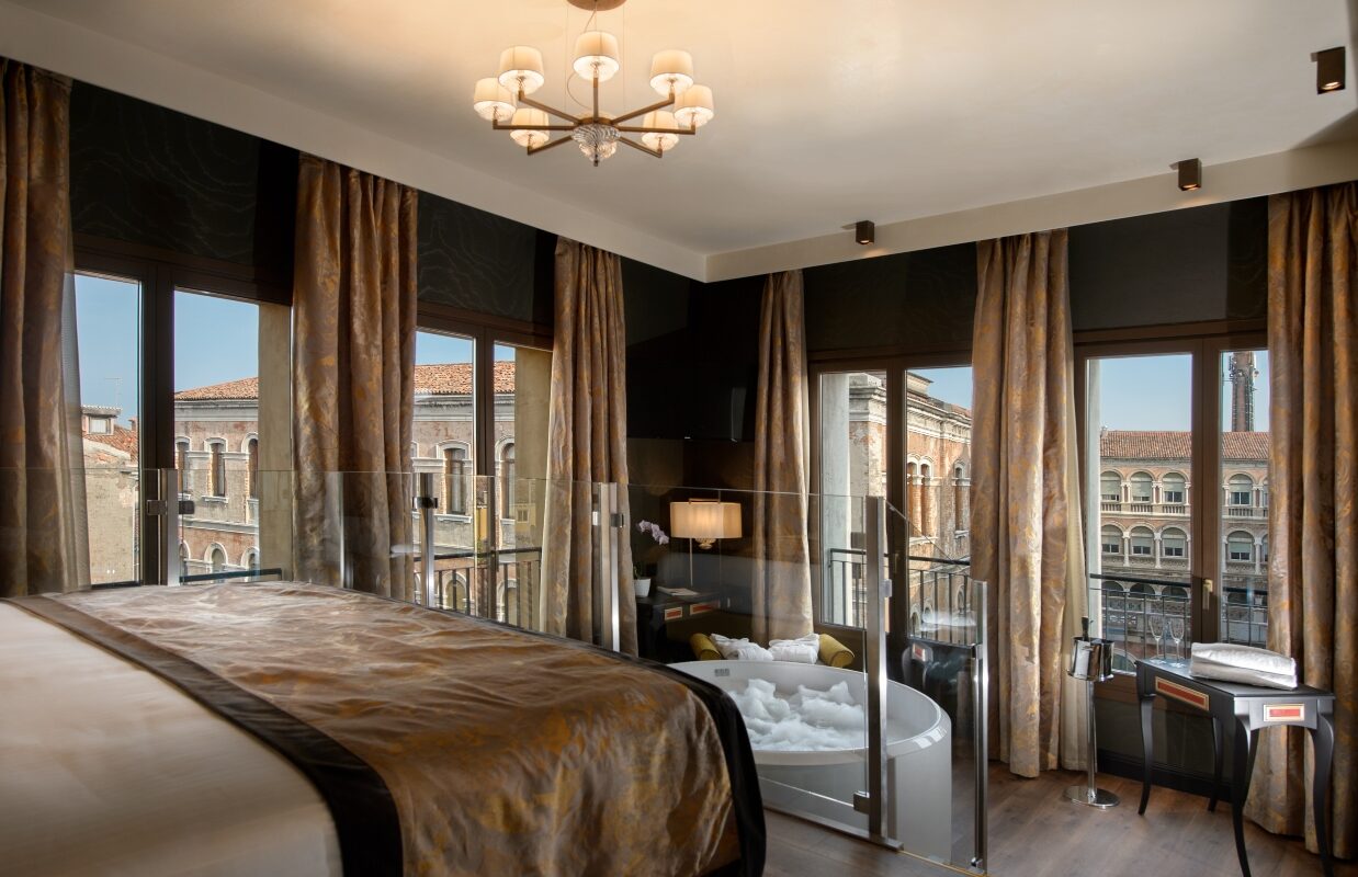 ¿Hay nada mejor que una bañera de hidromasaje con unas impresionantes vistas para relajarse? Muchas de nuestras habitaciones y suites tienen todavía más encanto gracias al jacuzzi, ubicado en la espectacular terraza privada o en un rincón panorámico de la habitación desde el cual podrá contemplar los tejados y las cúpulas de Venecia.