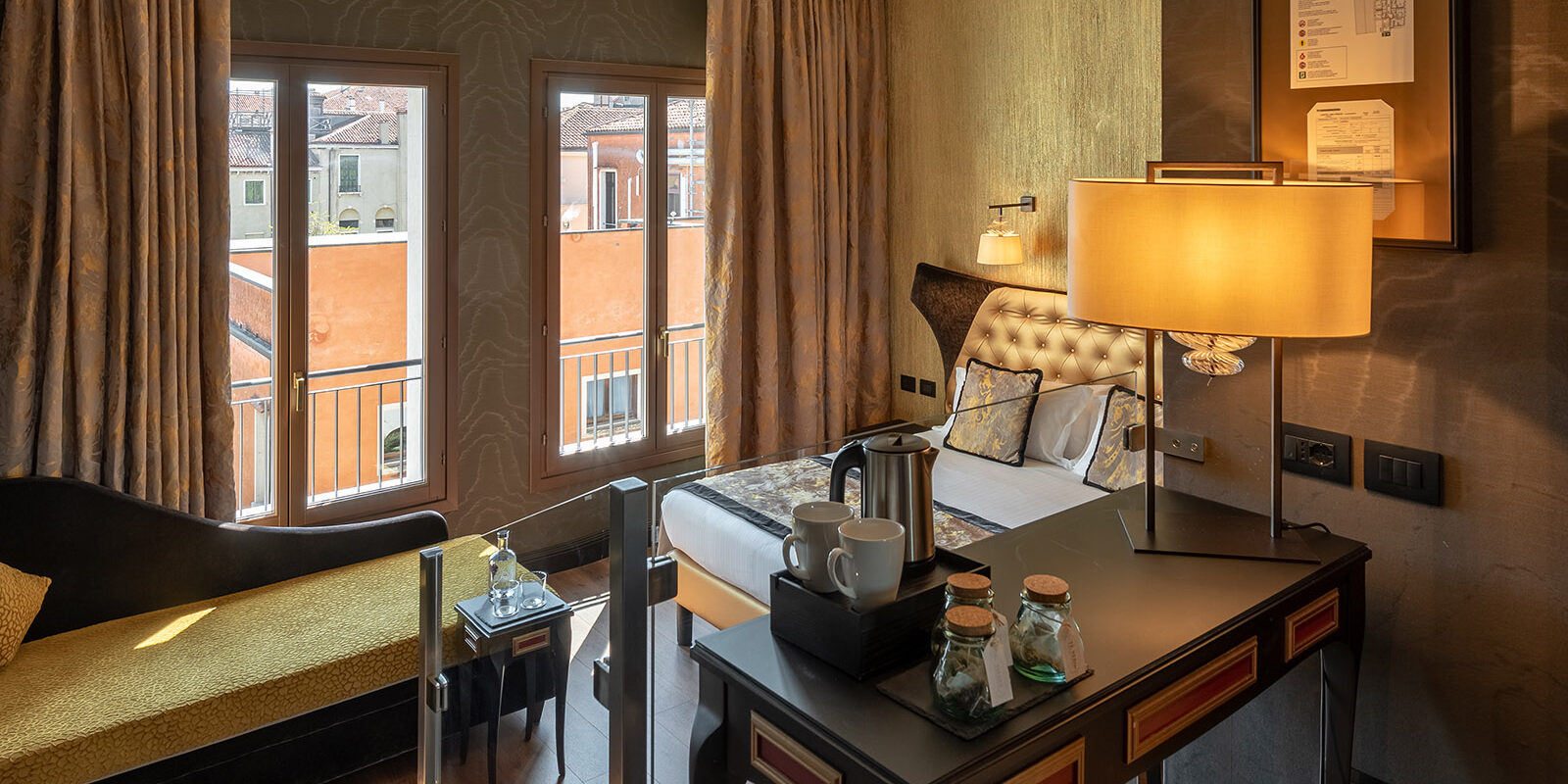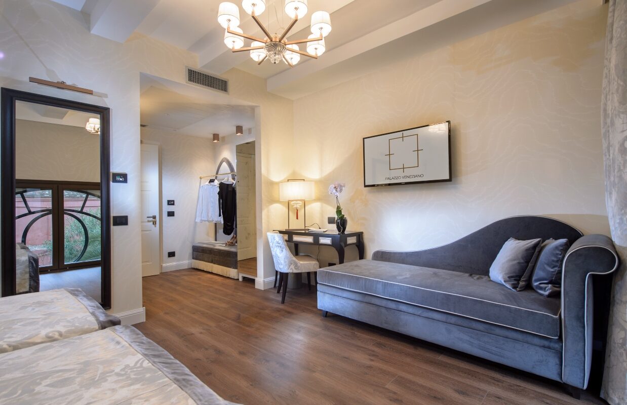 Parfaitement situé au premier et au quatrième étage pour s’imprégner du jardin verdoyant, ces chambres reposantes présentent un confort et une modernité sur une surface de 28 m². Disponible avec un grand lit, deux lits jumeaux ou un lit à baldaquin, les tons d’ivoire relaxant ou la version noire extravagante de ses damas caractérisent son style vénitien. Le mobilier fascinant composé d’une table d’écriture, d’une chaise, d’un pouf et d’une méridienne vous procure l’allure et le confort dans l’atmosphère des parquets en bois et des lampes en verre de Murano. La salle de bain, en marbre de Calacatta, offre aussi bien une douche à l’italienne qu’une baignoire, toutes les deux en Corian. Les lumières de chromothérapie et une coiffeuse avec un évier étincelant en feuille d’or complètent sa splendeur exceptionnelle.