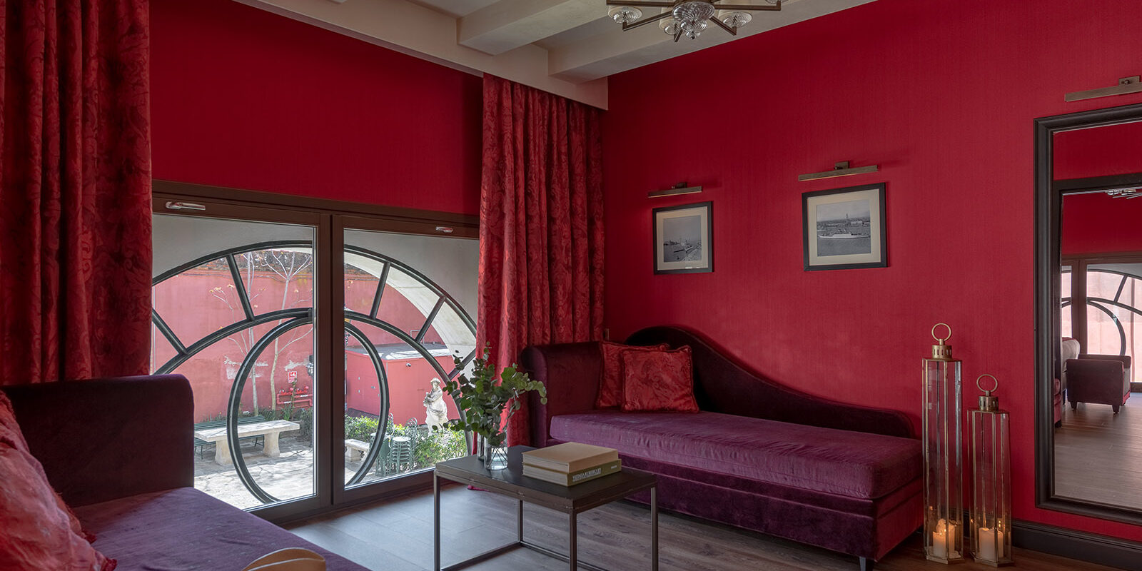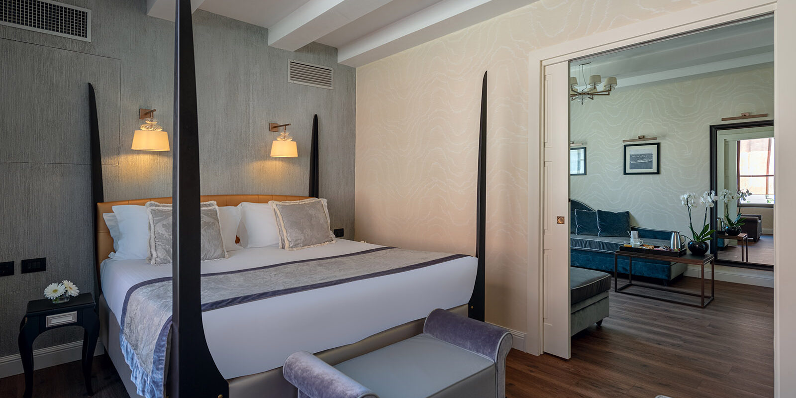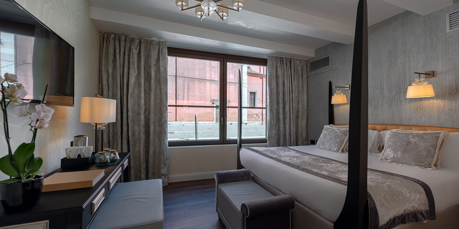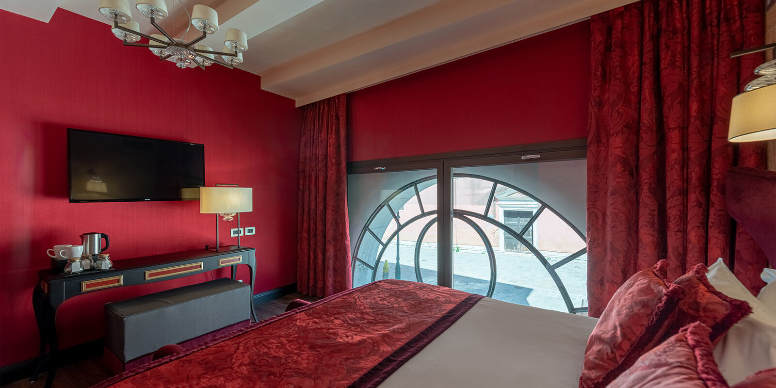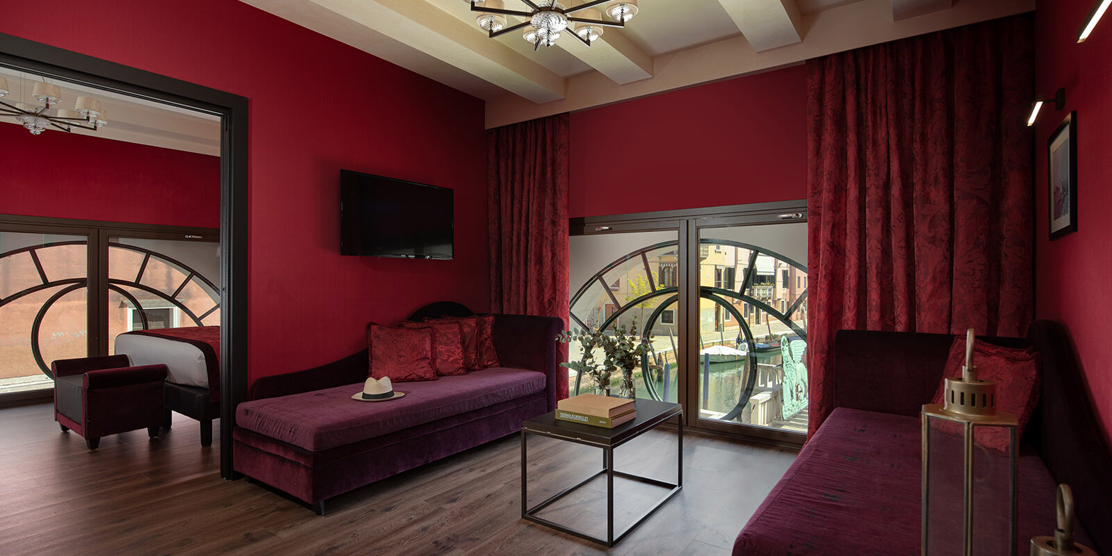 Idealmente collocate al piano terra e al primo piano, queste suite sono accoglienti ed elegantemente arredate nei toni avorio o rosso, e in una posizione perfetta per ammirare le barche e le gondole sul piccolo canale Ognisanti. Hanno uno spazio totale di 36m2, con un zona living con tavolo, sedia, pouf e chaise longue, e sono la scelta ideale per un soggiorno in famiglia. Lampadari in vetro di Murano, pavimenti in parquet e damaschi veneziani completano l’atmosfera elegante, mentre l’armadio a vista aggiunge un tocco di modernità. Disponibile con letto Queen size a baldacchino. Il bagno, in marmo Calacatta, offre una doccia grande in Corian. Cromoterapia e consolle con lavandino in foglia oro lucido ne completano l’eccezionale bellezza. Può ospitare fino a 4 persone.